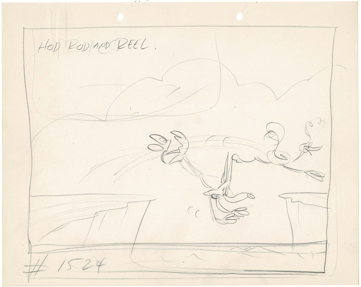 This very rare sketch was done by Mike Maltese and given to animator Willie Ito as a concept and reference for the lobby cards and publicity art for the 1959 classic, "Hot-Rod and Reel!" Sadly, we have not located an image of the final lobby card. From the Willie Ito collection. NOTE: it has a paperclip indentation in the upper left, as it was stored that way for decades. Measures approximately 9.5" x 12".