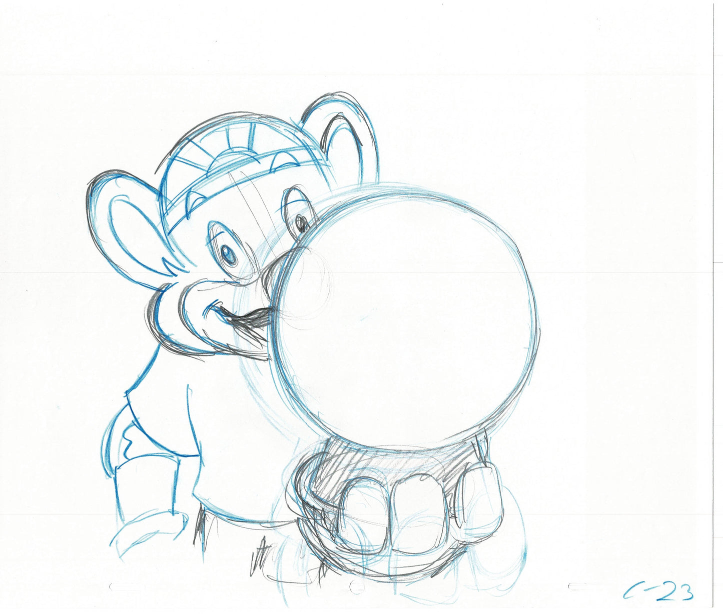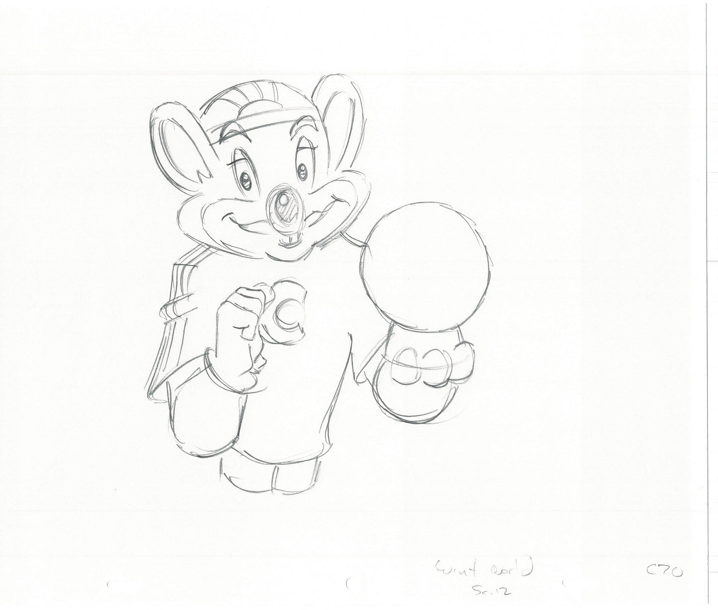 And this is from a classic 2005 commercial for Chuck E Cheese called "Winter World." These were wonderful mixed live-action/animated commercials. This is the smallest of the Chuck E. Cheese commercials we have (the fewest drawings). It includes 75 drawings (37 rough and 38 final). This set is missing the middle 2 scenes (where he hands the coin and throws the tickets) but has both the opening scene and the closing scene. A link to the commercial is below. This lot also includes some other random items, like a color copy of the background.
