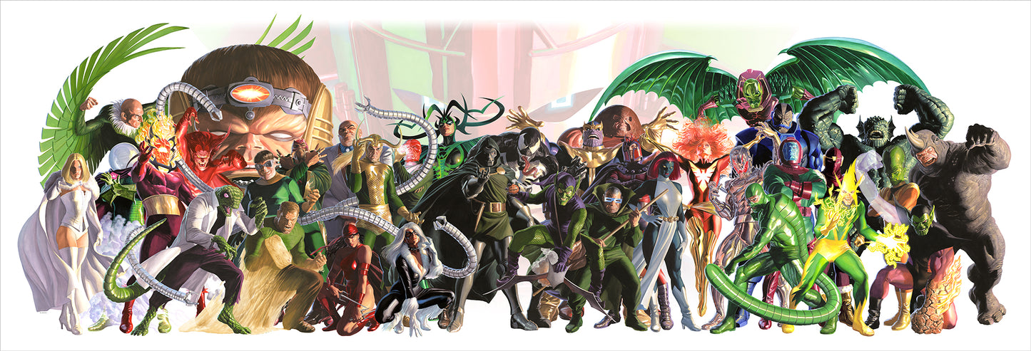 A true fine art piece, Alex Ross' Marvel Villains is a 50" x 18" Paper print. This dynamic illustration by Alex Ross was created as a companion piece to the hero’s mural created for the Marvel Studio’s corporate offices. Ross, rendering each character individually, pays homage to the rich history of Marvel Comics and their most notorious bad guys. Featured are Emma Frost, Namor, Mysterio, Vulture, Dormammu, Mephisto, Lizard, MODOK, Doctor Octopus, Sandman, The Mandrain, Kingpin, Elektra, Loki, Red Skull, Black Cat, Hela, Doctor Doom, Venom, Green Goblin, Thanos, Mole Man, Juggernaut, Magneto, Raven, Dark Phoenix, Ultron, Annihuls, Scorpion, Apocalypse, Kang the Conqueror, Zemo, Electro, Abomination, The Leader, Super-Skrull and Rhino.