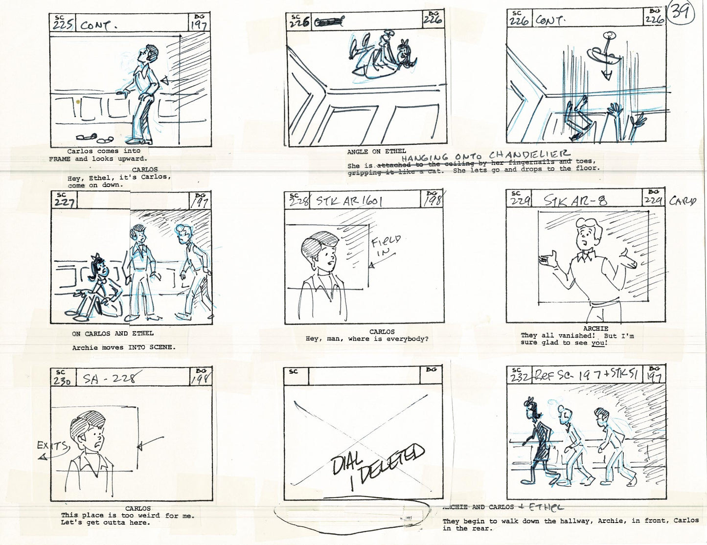 There's dialogue, action notes and scene numbers - it's a wonderful summary of these wonderful old cartoons! These are generally a mix of graphite pencil drawing/dialogue, ink and some COPIED panels (which are also sometimes hand-drawn over). Also - frequently the panels are drawn and then cut out and taped down in a new order. See picture and feel free to ask about individual panels.