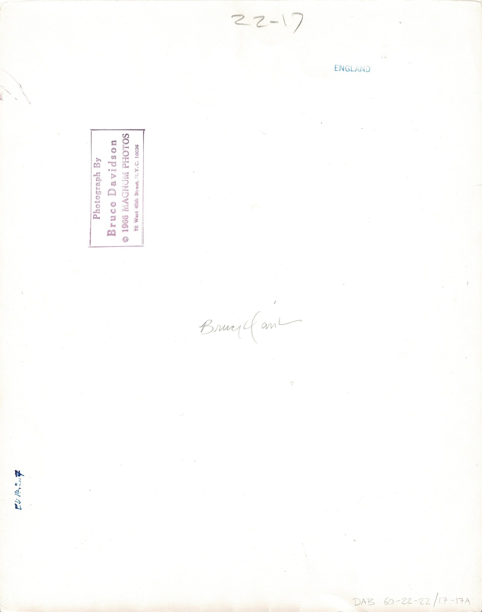 Signed, negative notation 60-22-22/17-17A in pencil, stamped England and Davidson/Magnum Photos copyright credit stamp, verso.