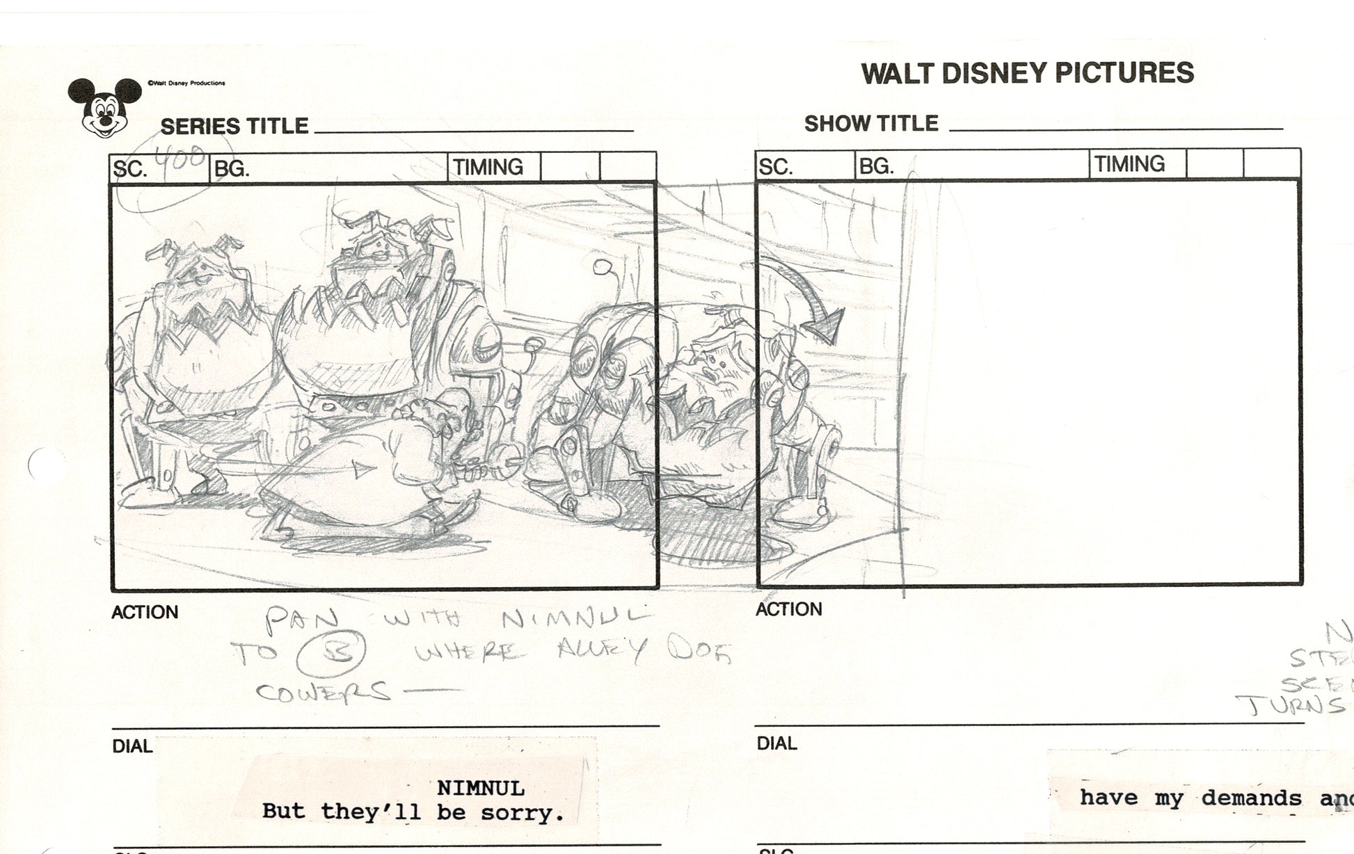 Fast forward to 2025 and the Disney archives joined with a number of other companies to sell items direct via an auction at Sotheby's. We purchased the hand-drawn storyboard set from this episode (of which this page is a part) they sold at this auction. These are EXTREMELY rare! Much more rare than cels or drawings.
