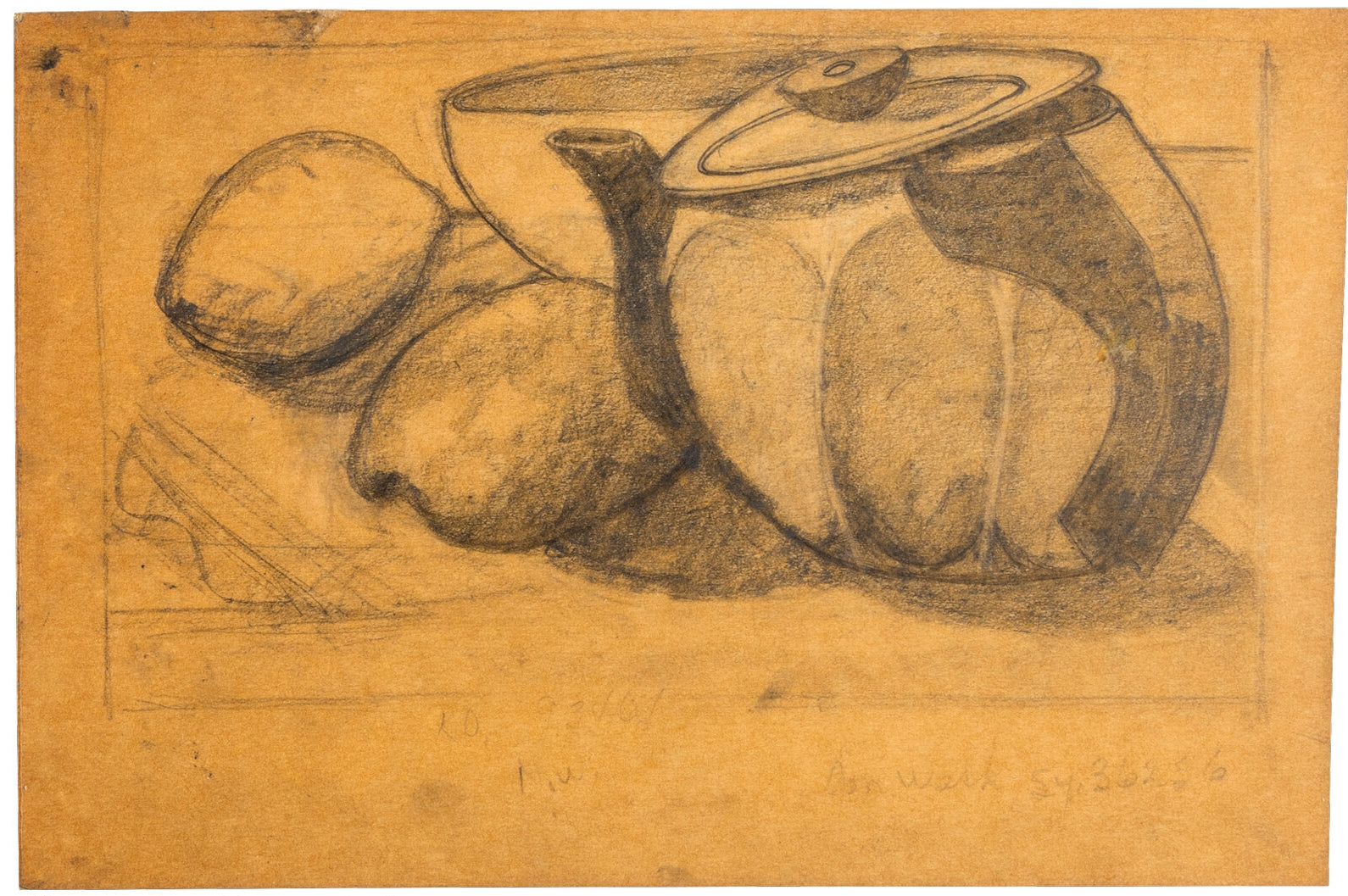 Graphite on dark card-stock. Some adhesive residue on back. We have several of these lovely drawings and they measure between 6.5" x 5.75" to 5.75" x 9.25".