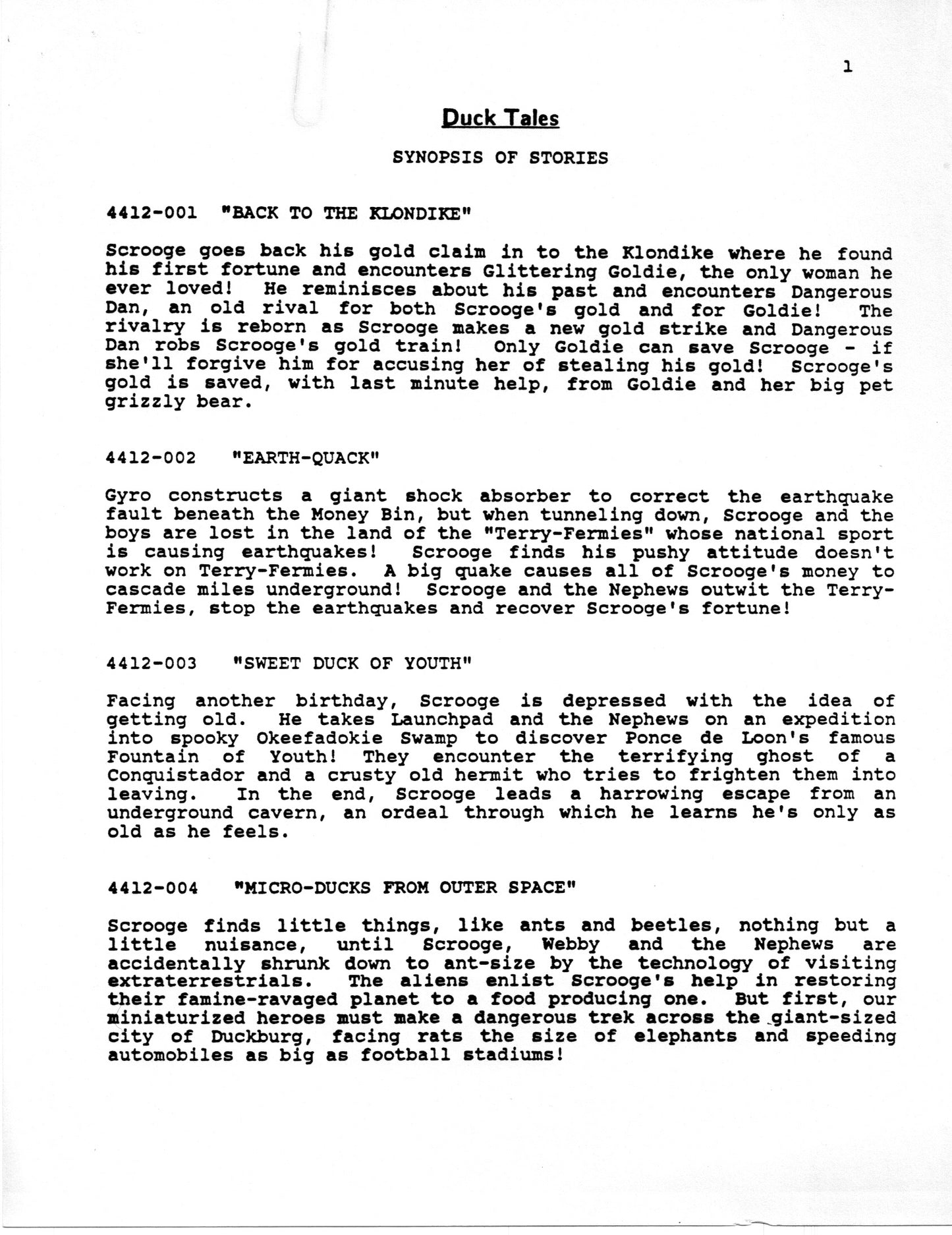 DUCKTALES Disney Production EPISODE Show Synopsis Copy from Wendell Washer Animators Estate 1989