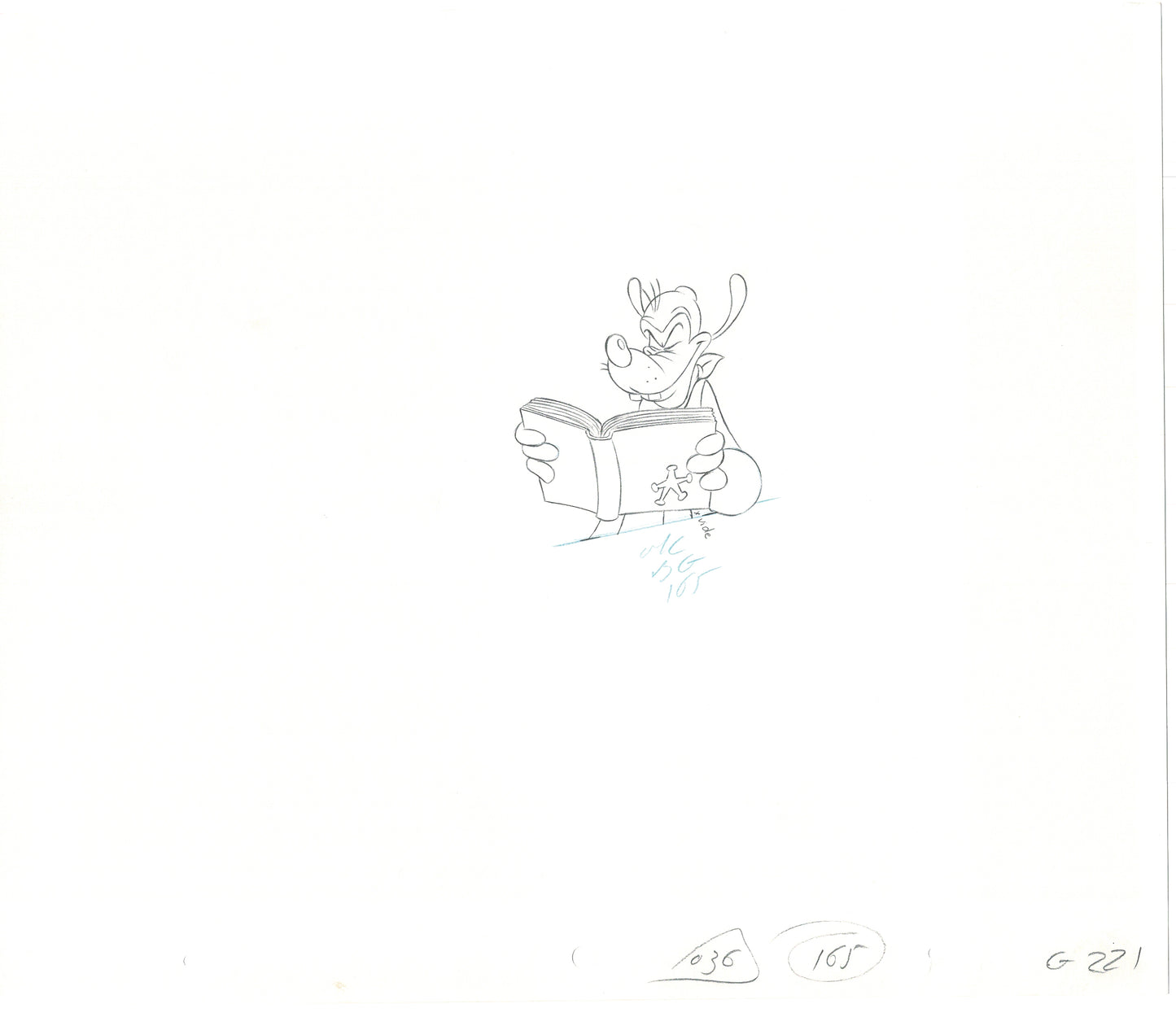 Goof Troop was about Goofy as a single father to Max. It ran from 1992-1993, and had an Xmas Special and two follow-up films! This is from Episode 65, "Gunfight at the Okie-Dokie Corral Episode, where cowboy Goofy is in a trough with a book (around the 13:47 mark). The drawing measures approximately 10 5/8" x 12 5/8"