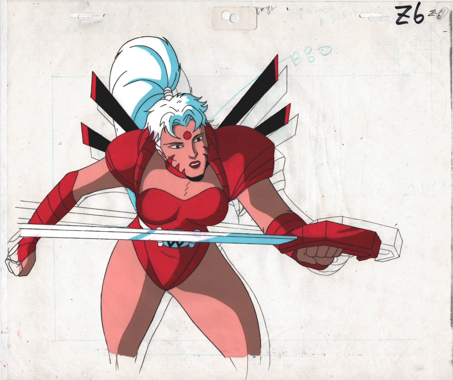From the 1994/5 Nelvana adaptation of Jim Lee's WildC.A.T.S. This is a smokin' hot production animation art cel of Zealot. Measures approximately 10.5" x 12.5" but drawing overlap may be a bit larger.