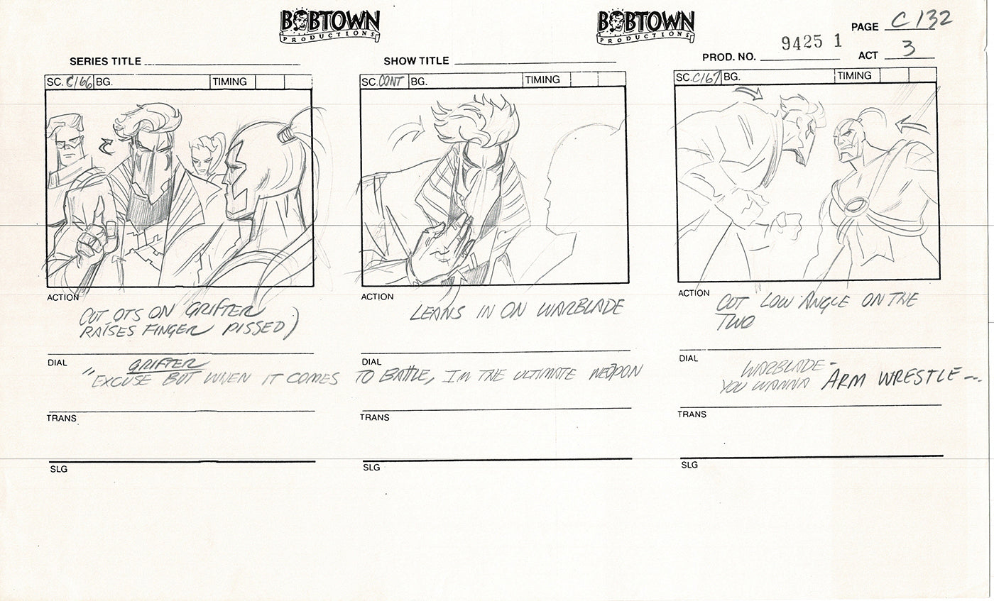From the 1994/5 Nelvana adaptation of Jim Lee's WildC.A.T.S. comic. These hand-drawn storyboards are the actual, one of a kind, final storyboards for the episode you watched in 1994!