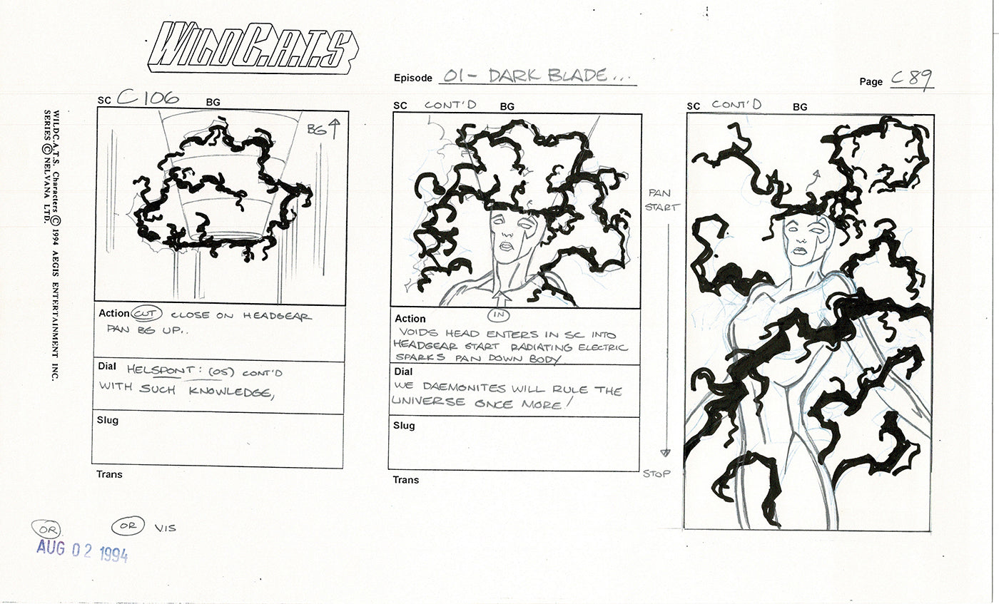 From the 1994/5 Nelvana adaptation of Jim Lee's WildC.A.T.S. comic. These hand-drawn storyboards are the actual, one of a kind, final storyboards for the episode you watched in 1994!