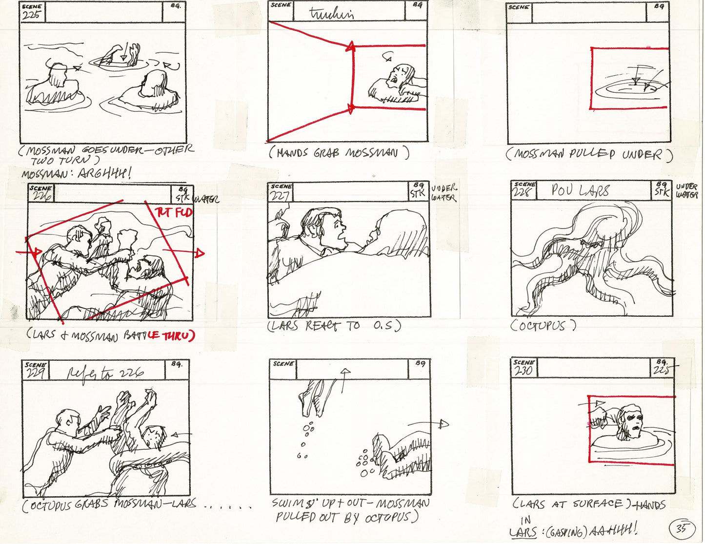 There's dialogue, action notes and scene numbers - it's a wonderful summary of these wonderful old cartoons! These are generally a mix of graphite pencil drawing/dialogue, ink and some COPIED panels (which are also sometimes hand-drawn over). Also - frequently the panels are drawn and then cut out and taped down in a new order. See picture and feel free to ask about individual panels.