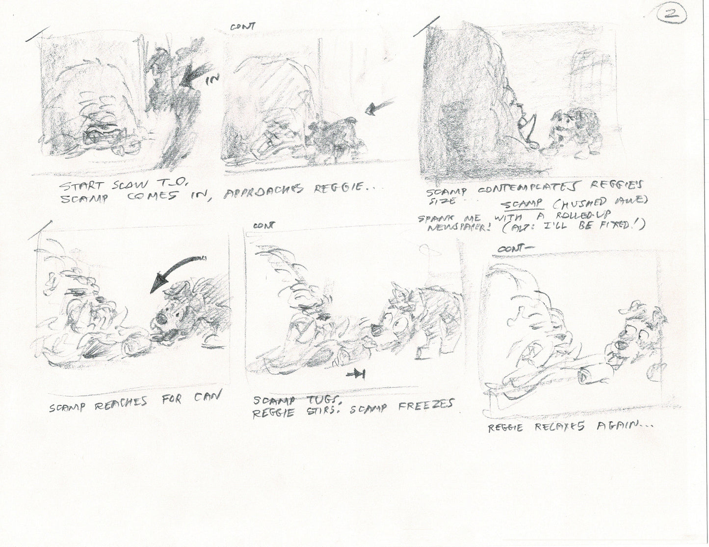 He did work on a LOT of this movie. And we have just under 100 of the original drawings he made while in production for this Lady and the Tramp sequel. The drawings include raw and development sketches on 8.5” x 11” paper, larger gorgeous scene drawings, story and character notes, storyboard drawings on Disney Storyboard paper, character model practice sheets, doodles and more. This is one of those!