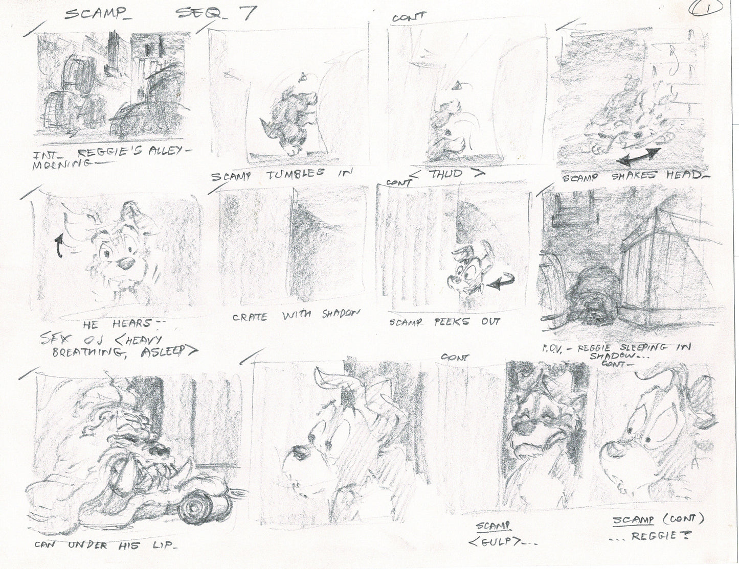 He did work on a LOT of this movie. And we have just under 100 of the original drawings he made while in production for this Lady and the Tramp sequel. The drawings include raw and development sketches on 8.5” x 11” paper, larger gorgeous scene drawings, story and character notes, storyboard drawings on Disney Storyboard paper, character model practice sheets, doodles and more. This is one of those!