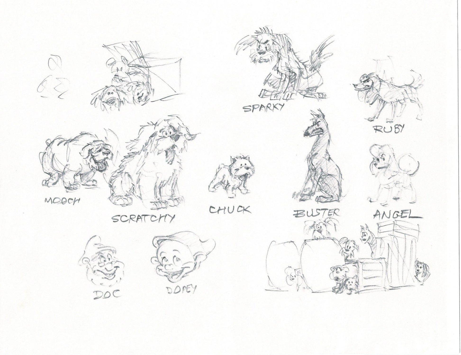 He did work on a LOT of this movie. And we have just under 100 of the original drawings he made while in production for this Lady and the Tramp sequel. The drawings include raw and development sketches on 8.5” x 11” paper, larger gorgeous scene drawings, story and character notes, storyboard drawings on Disney Storyboard paper, character model practice sheets, doodles and more. This is one of those!