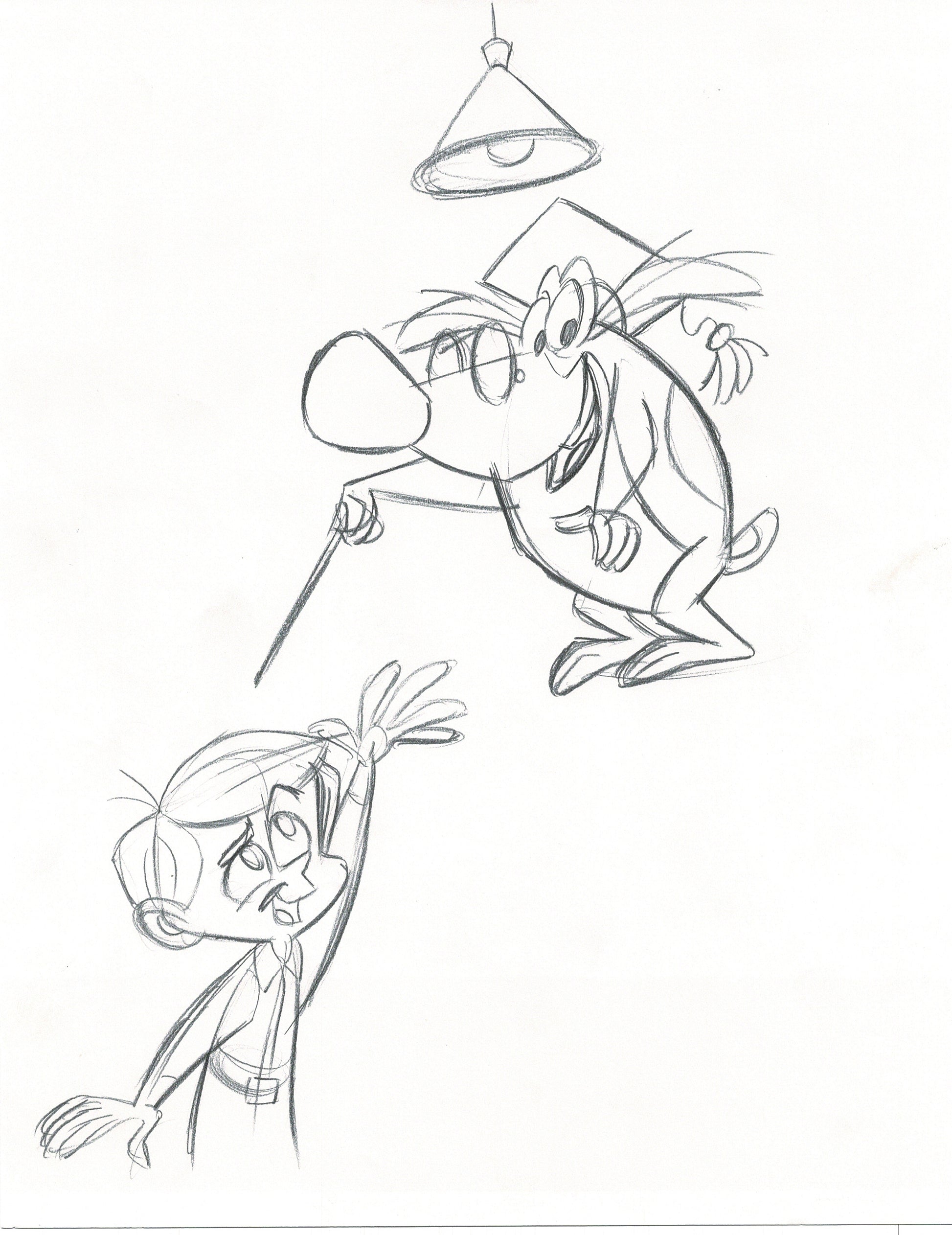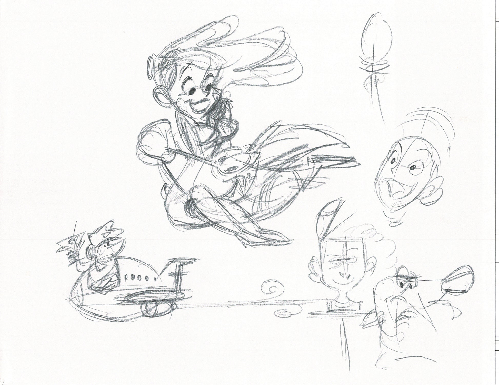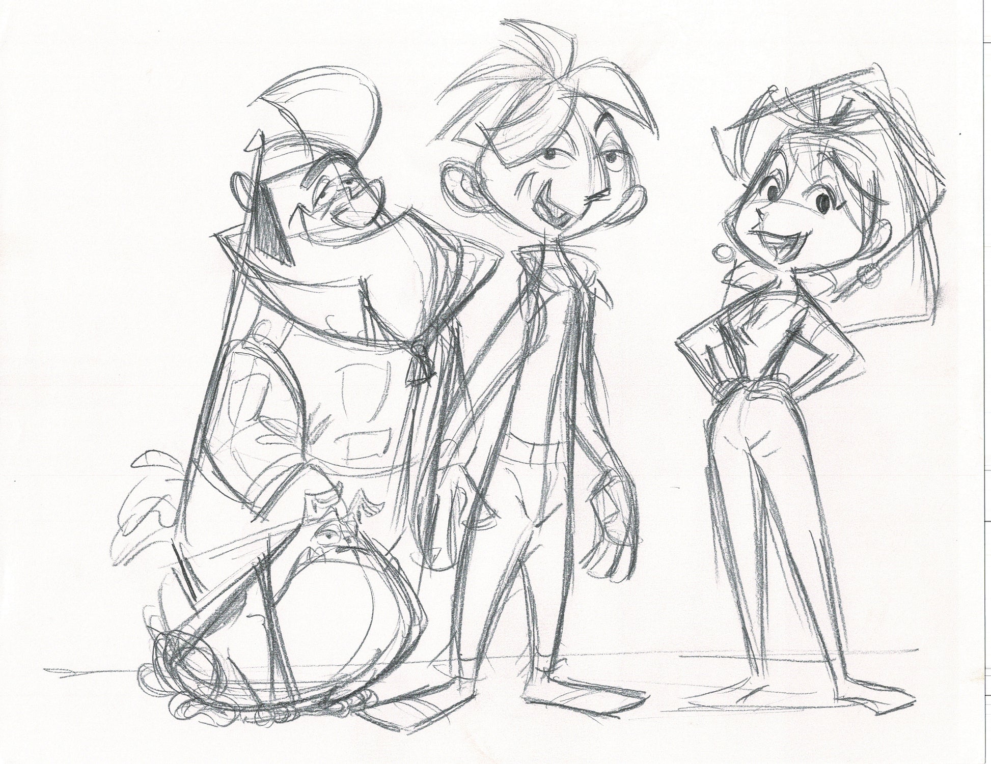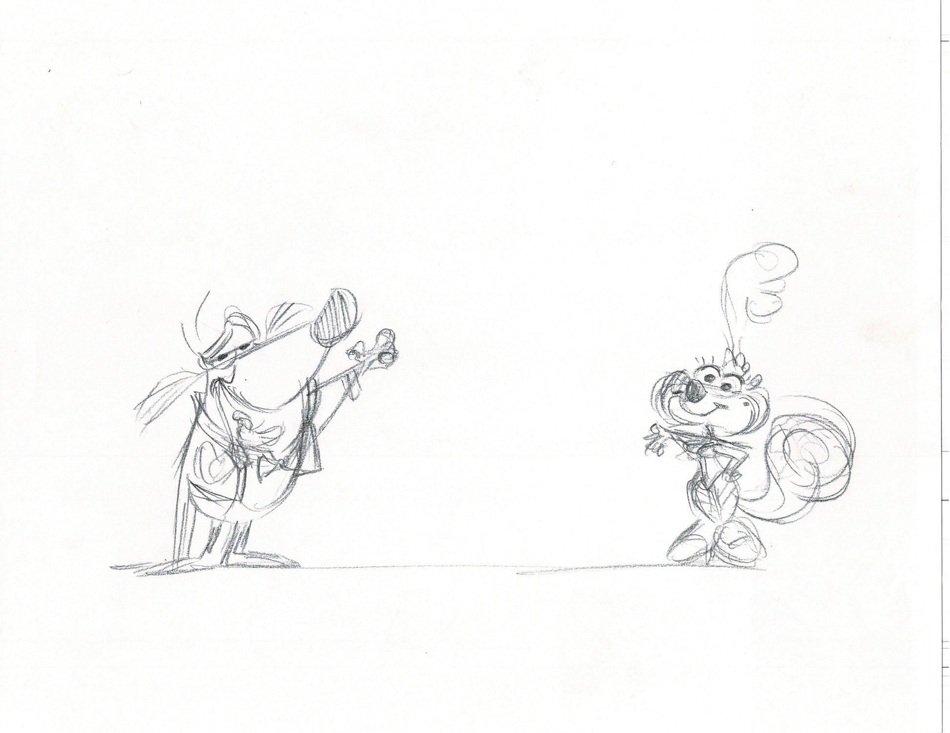 Len Smith has worked on an amazing array of cartoons including The Little Mermaid and Talespin to just name a few. Here's a WHOLE STACK of hand-drawn art in graphite on 8.5" x 11" paper - 62 pages to be exact, by this famous animator. It appears to be the preliminary work for a show he was calling "The Amazing Artie and Juanita."