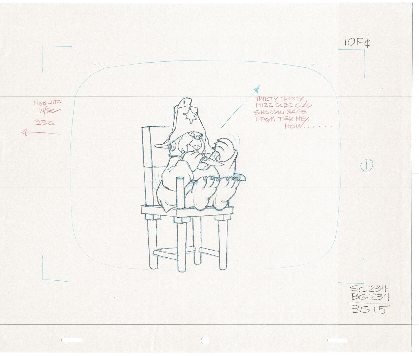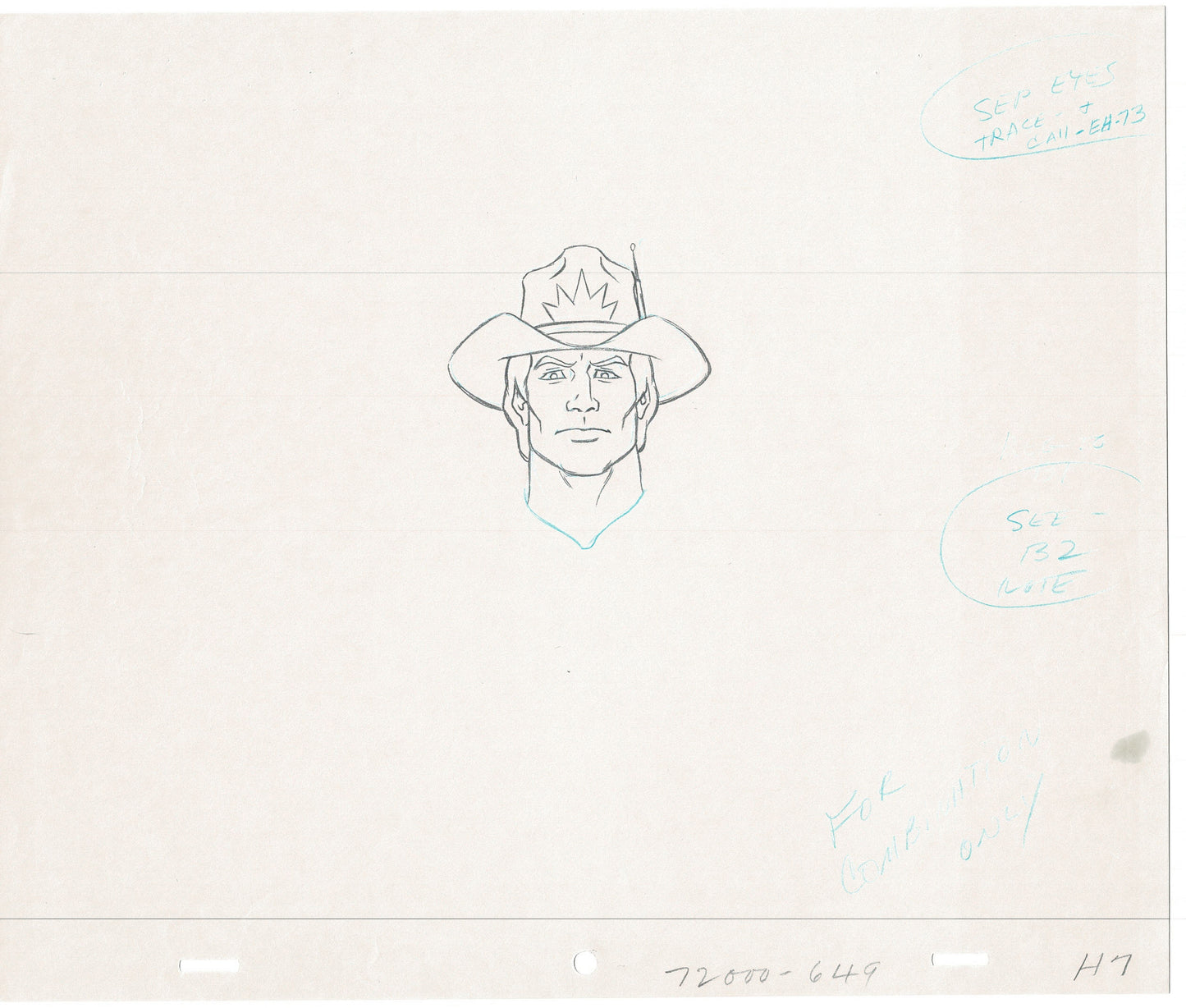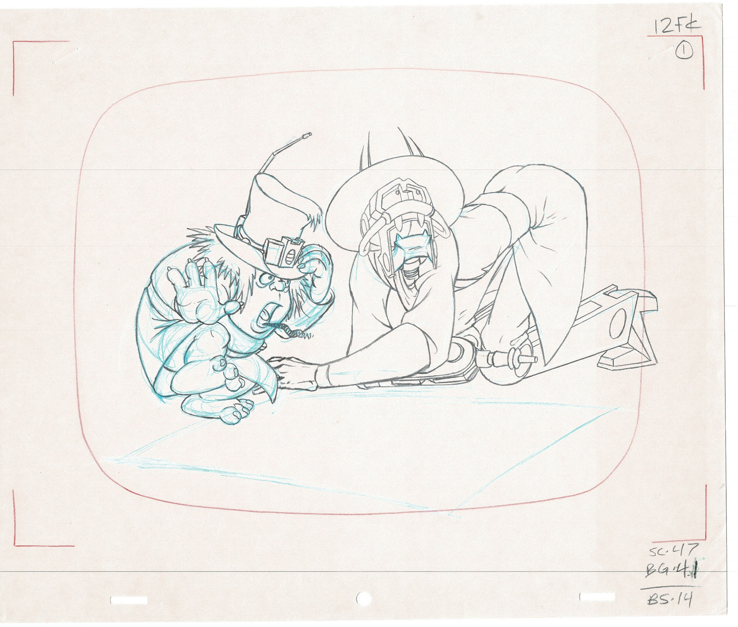 Animation production drawings are where the real art is in animation. We have a whole bunch of these up for sale from this episode. Some have folds, tears, parts that are photocopied, etc. Measures approx 10.5" x 12.5". Yellowed with age.