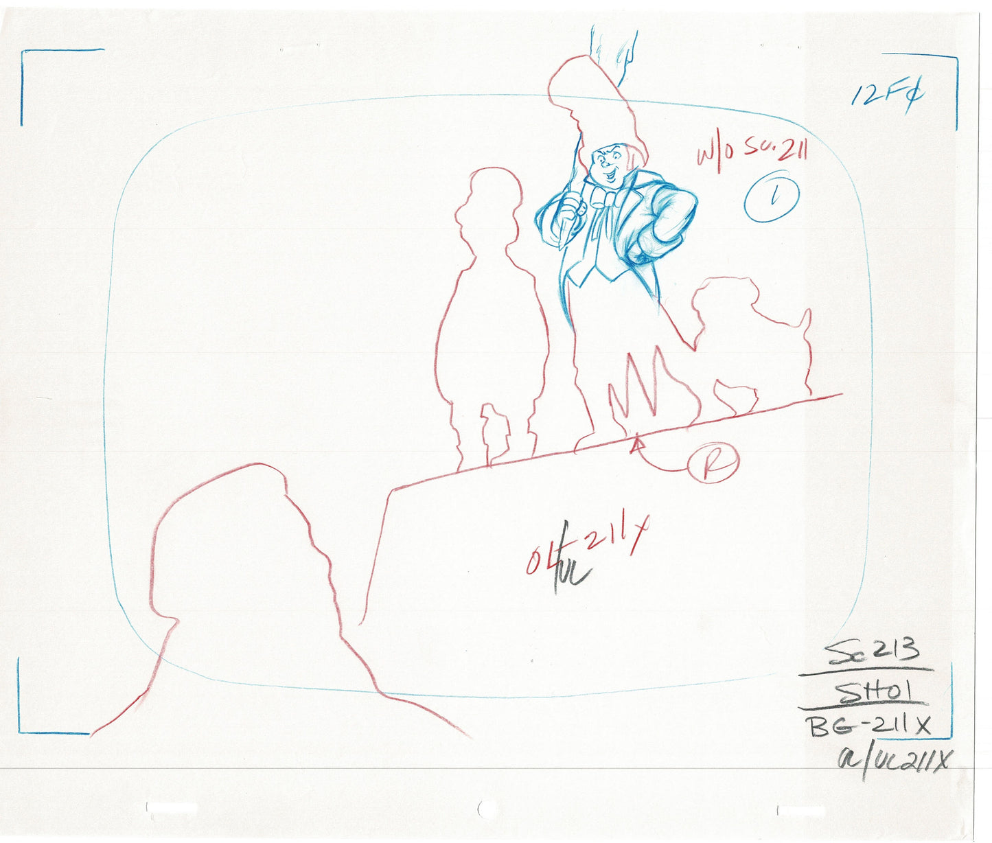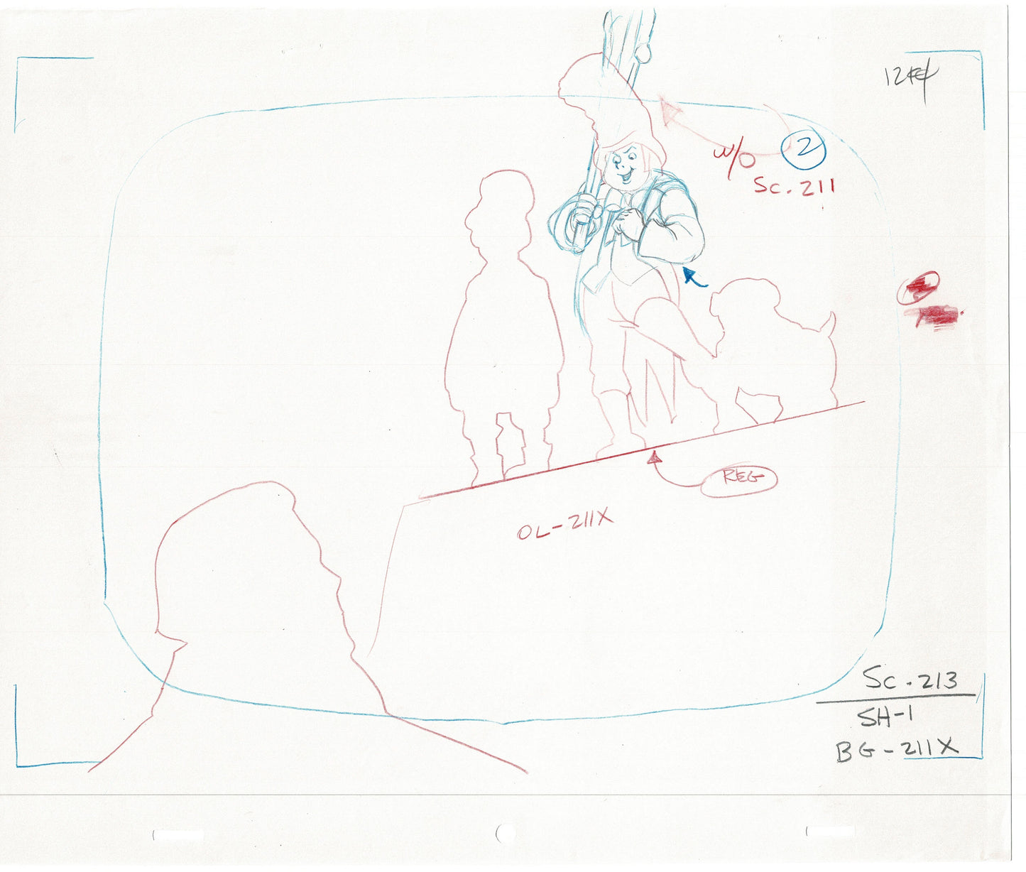 Animation production drawings are where the real art is in animation. We have a whole bunch of these up for sale from this episode. Some have folds, tears, parts that are photocopied, etc. Measures approx 10.5" x 12.5". Yellowed with age.