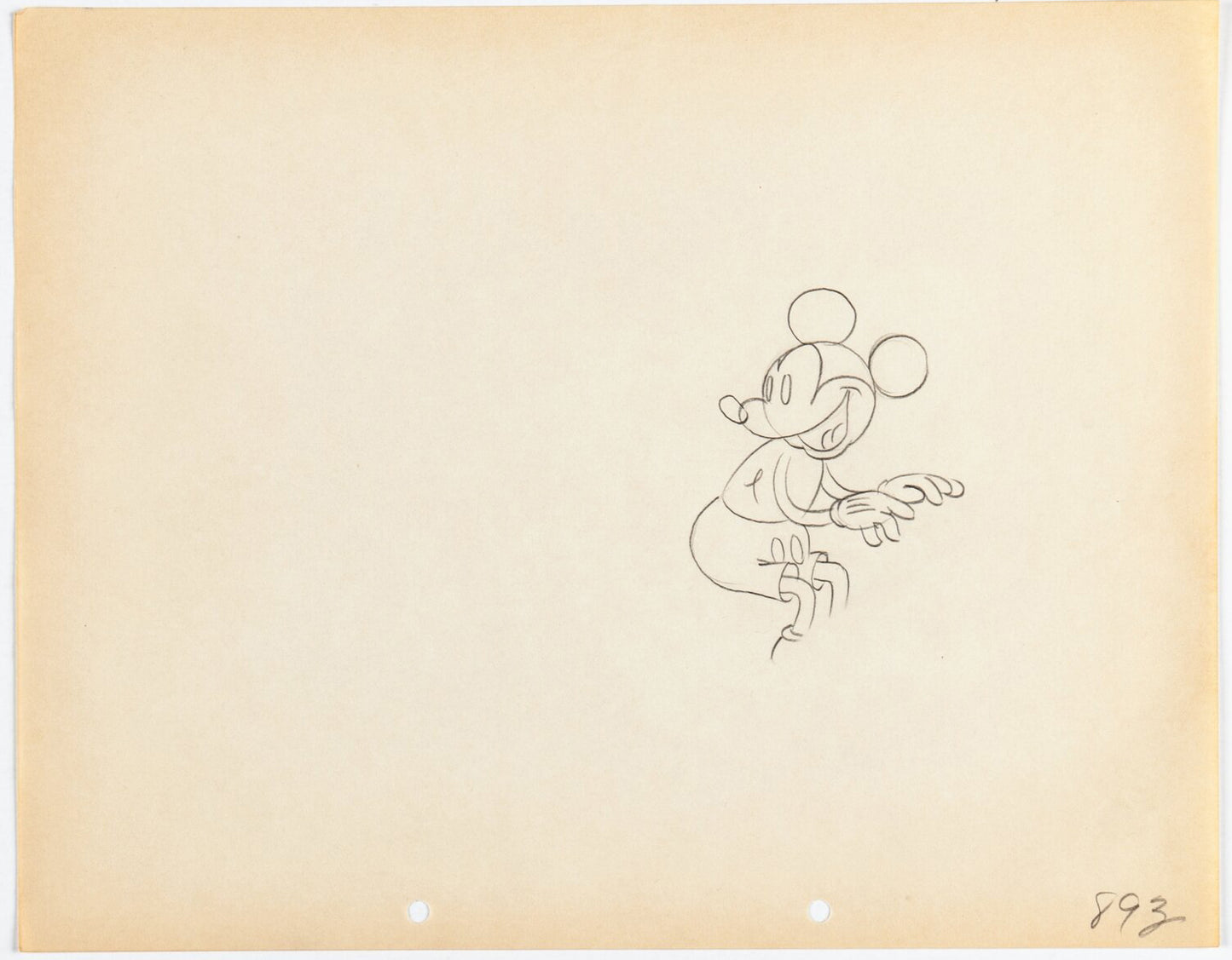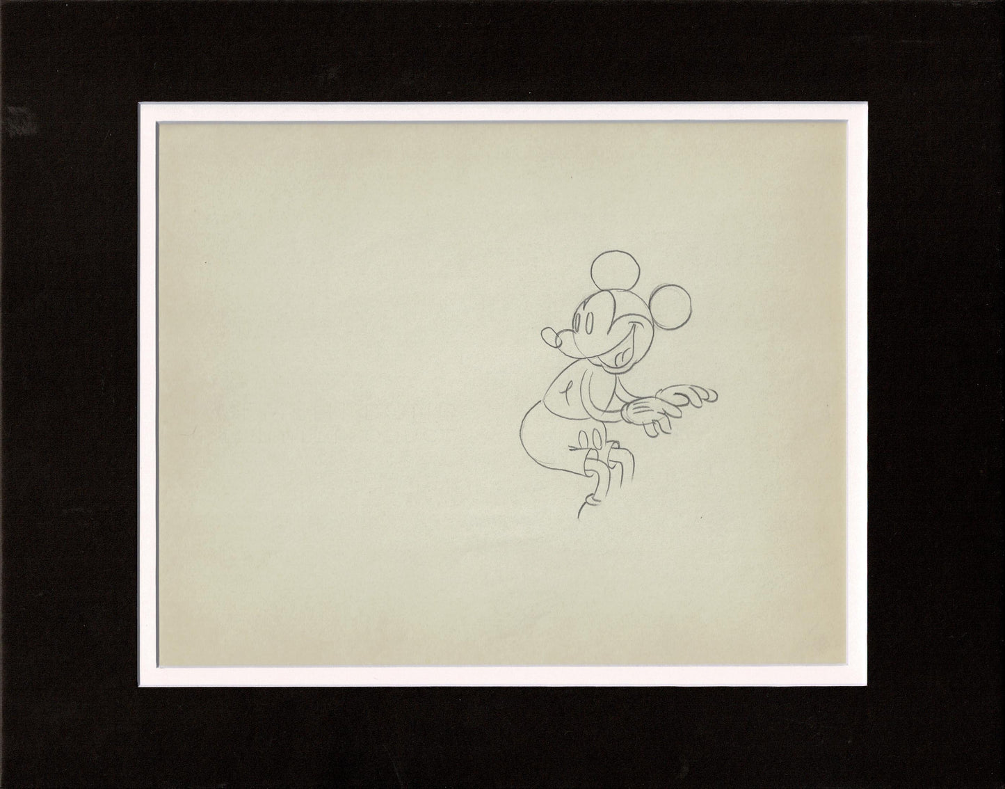 The sheet is 2-peghole animation paper and is toned warm yellow with age. There's a slight wrinkling under Mickey that does not affect the image. It's from around the 2:58 mark (depending on the version) - we grabbed a screen cap from the section (see above - though it was HARD to screenmatch this one to the exact moment since Mickey is playing for several minutes). Paper measures 9.5" x 12". It has a light diagonal fold that starts about 2" down from the top of the left side to the middle of the top edge.