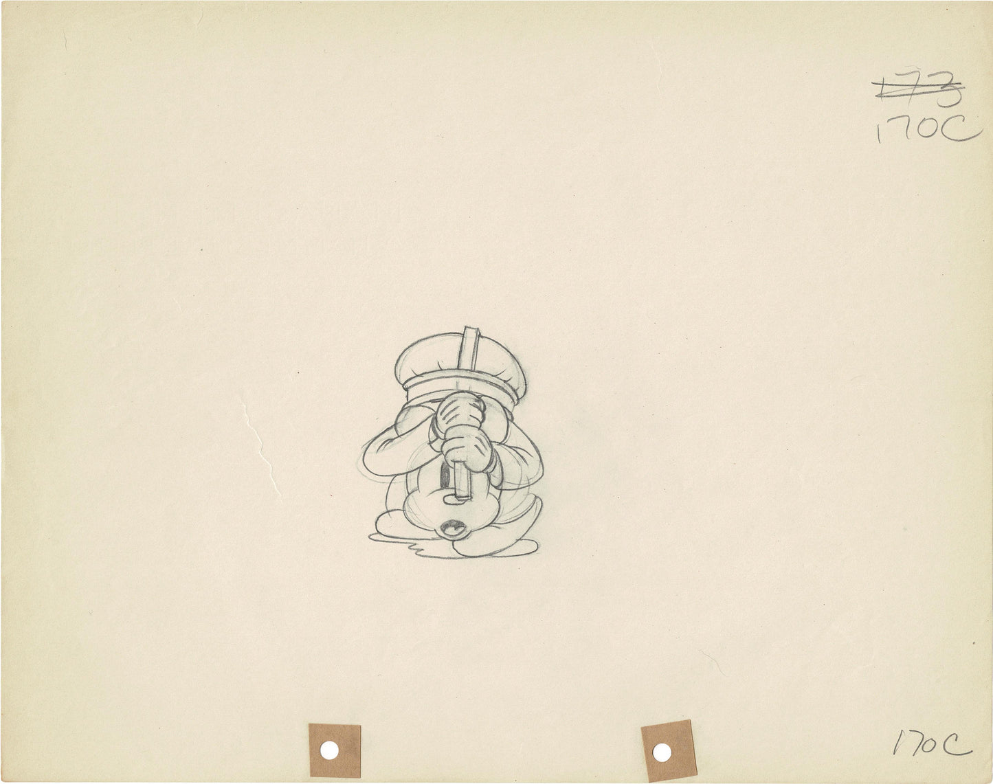 The sheet is 2-peghole animation paper (with reinforced holes) and is toned warm yellow with age. We believe this is from right around the 2:58 mark - we grabbed a screen cap from the section (see above). There's an internal crease/crinkle to the left of Mickey. We'll include a Charles Scott Gallery COA.
