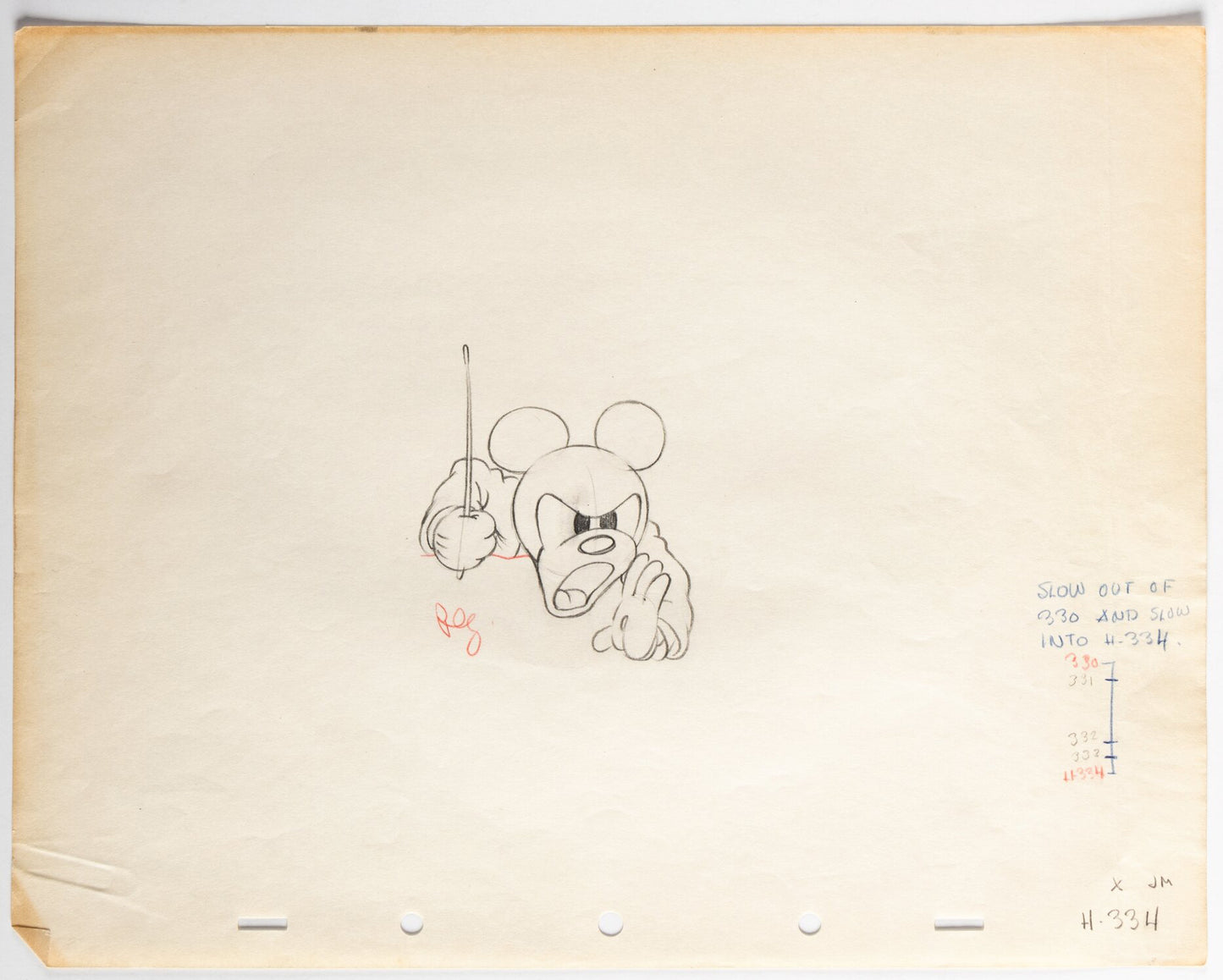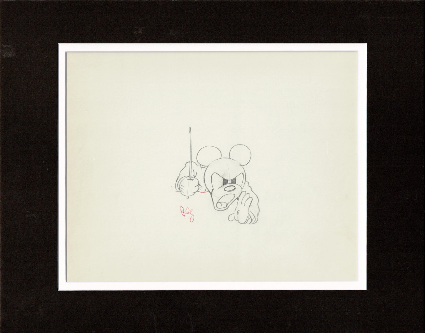 The sheet is 5-peghole animation paper and is toned warm yellow with age. It's from around the 5:30 mark (depending on the version) - we grabbed a screen cap from the section (see above). Measures 9.5" x 12". Has a vertical fold about 1" from the right edge and a paperclip indent on the lower left corner - both of which are not seen when matted. There is the faintest crease down the center of the drawing.