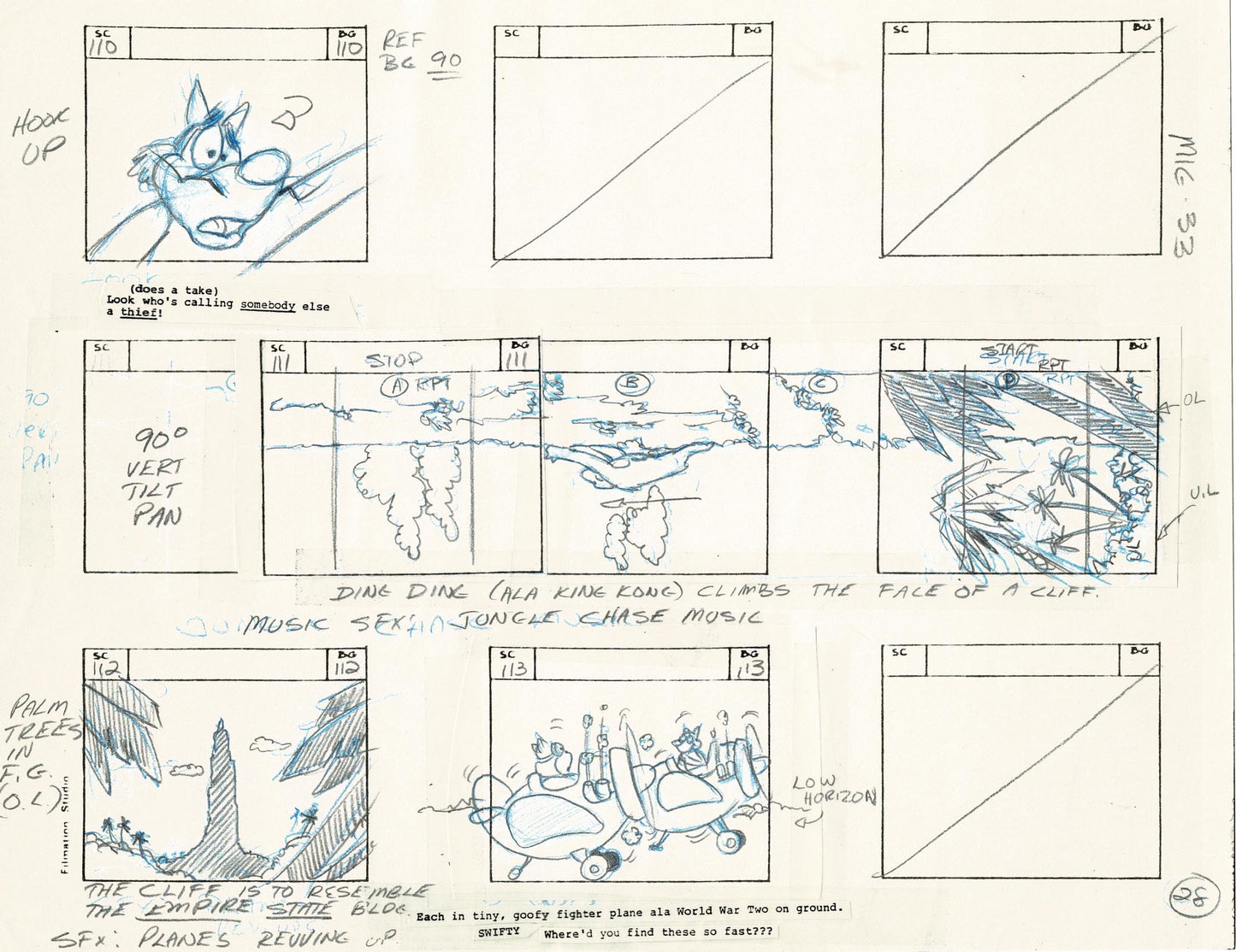There's dialogue, action notes and scene numbers - it's a wonderful summary of these wonderful old cartoons! These are generally a mix of graphite pencil drawing/dialogue, ink and some COPIED panels (which are also sometimes hand-drawn over). Also - frequently the panels are drawn and then cut out and taped down in a new order. See picture and feel free to ask about individual panels.