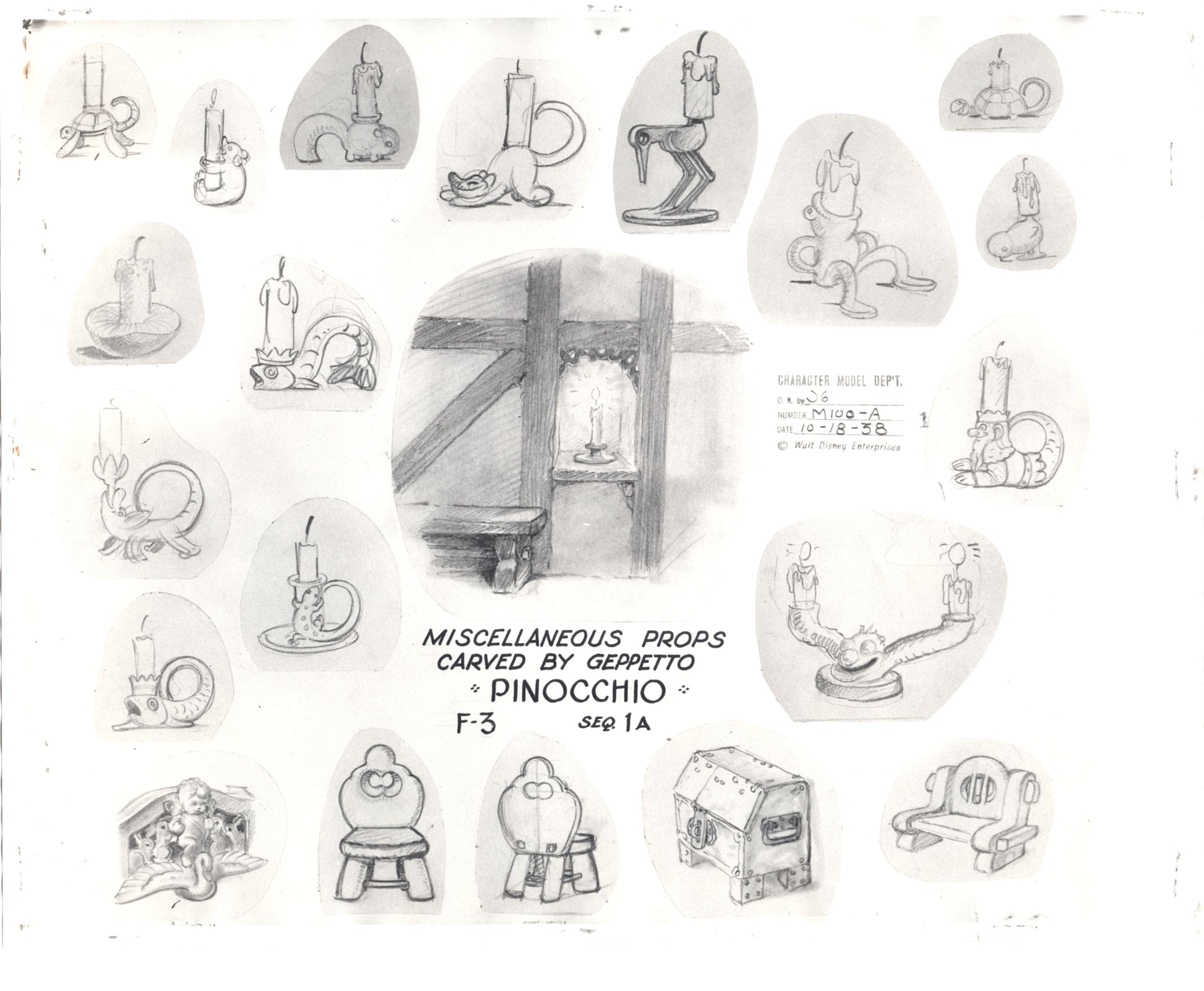 We purchased a stack of animator's model sheets used in the Walt Disney feature Pinocchio, from 1940. The model sheets were used during production (prior to the release) to make the film. Model sheets are used to keep things consistent (across animators) through the life of production of a film or show.