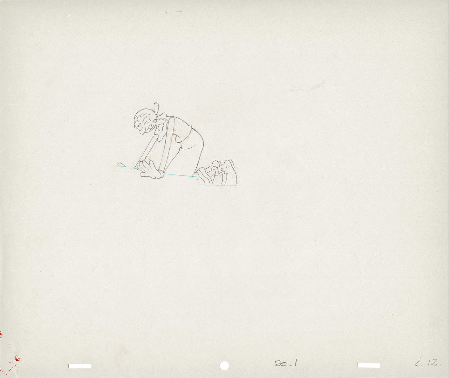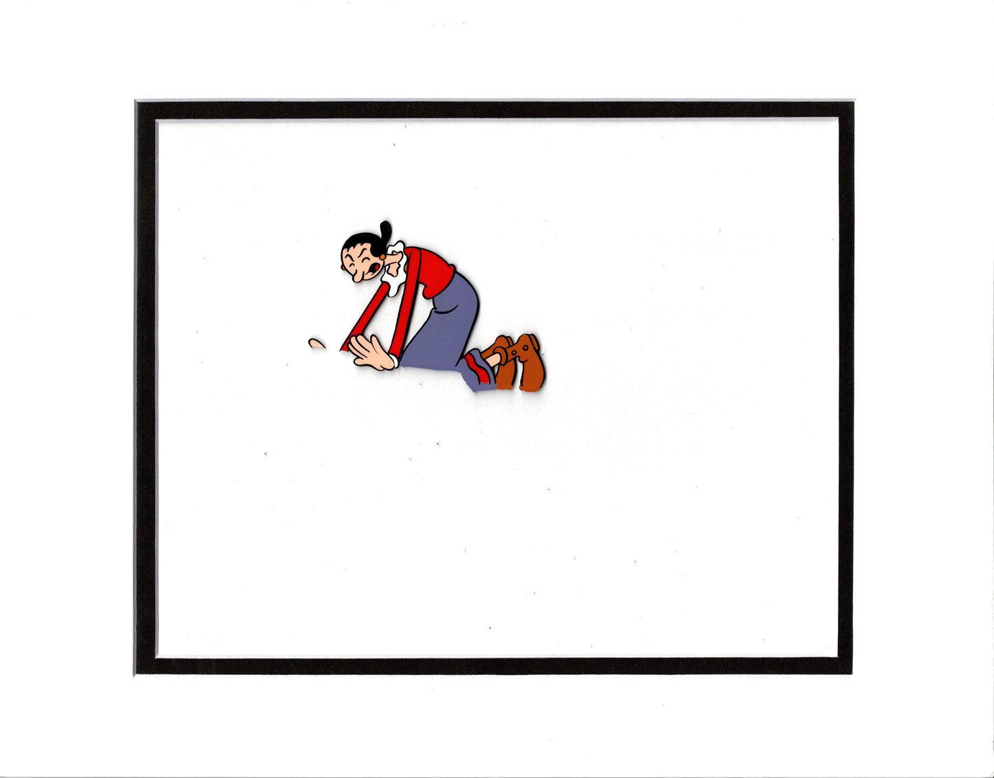 Sadly, we're not sure what iteration of Popeye this is from, but the lines appear to be hand-inked, which puts it in the 1960's or before. And the cel comes with the matching production drawing.