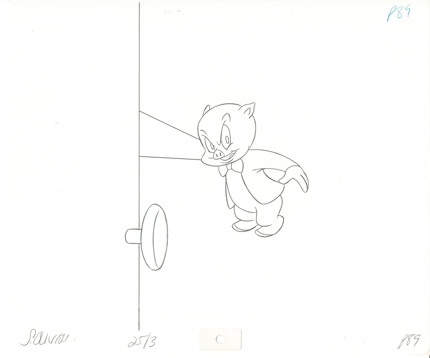 A very nice drawing! It is of course Porky Pig closing the door on us! There's a chance this is from a commercial or perhaps a Cartoon Network bumper. The paper measures approximately 10.5" x 12.5".