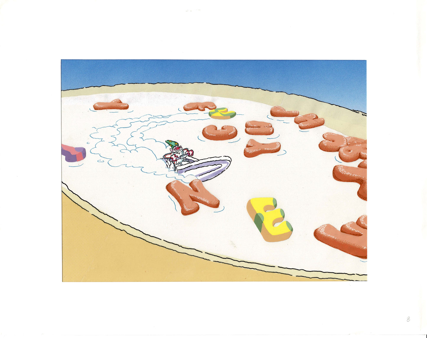 MMMMM - Alpha-Bits! Remember em floating around in the milk in your bowl as a kid? This is a multi-layer production cel from a commercial. Not sure what era, but done by R O Blechman Ink Tank animation studio and from the Jerry Weist estate. Standard size 12-field animation cels (10.5" x 12.5") but they have a "matting" type thing pasted to the front and back - made just out of regular paper, so to really mat them you'd want to replace that.