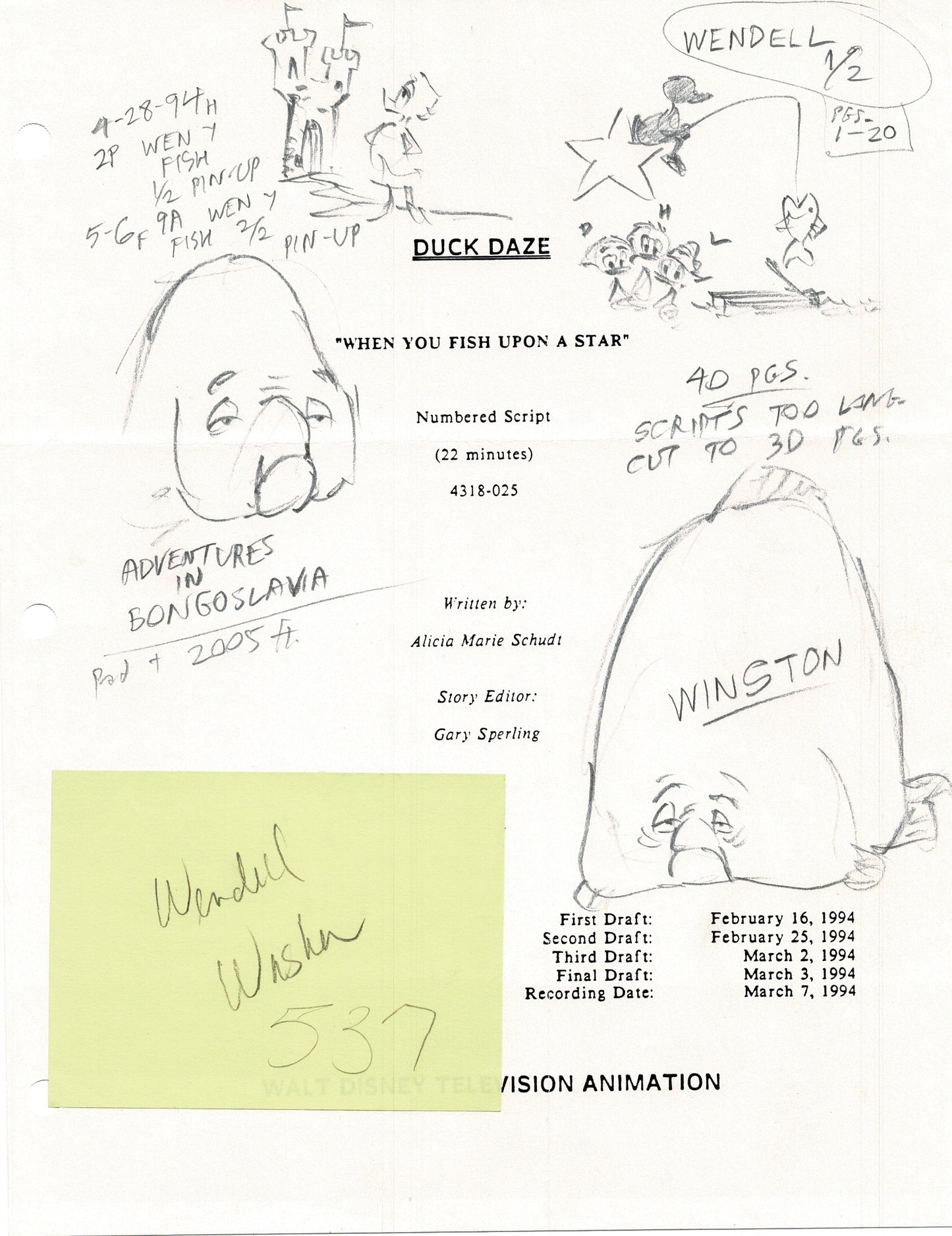 Quack Pack Disney Production Animation Script Copy WITH MANY DRAWINGS from Animator Wendell Washer's Estate 1996 wus