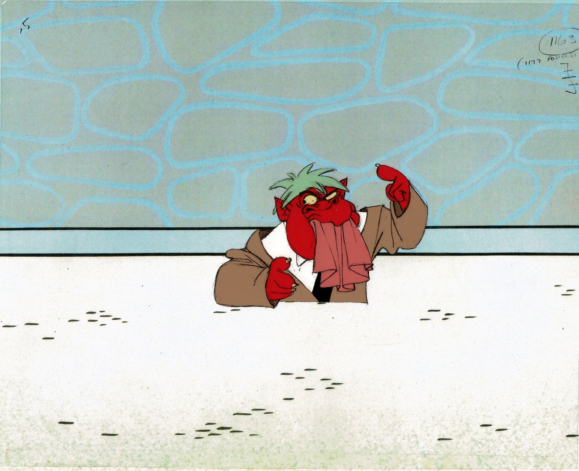 This cel is in good shape for its age, with a bit of line loss here and there and some rubbing. Some of these are attached to the bottom strip with tape at the time of production (SEE PICS) AND some of these have lost that bottom production strip - see the pictures to see which this is. Comes with a color copy background.