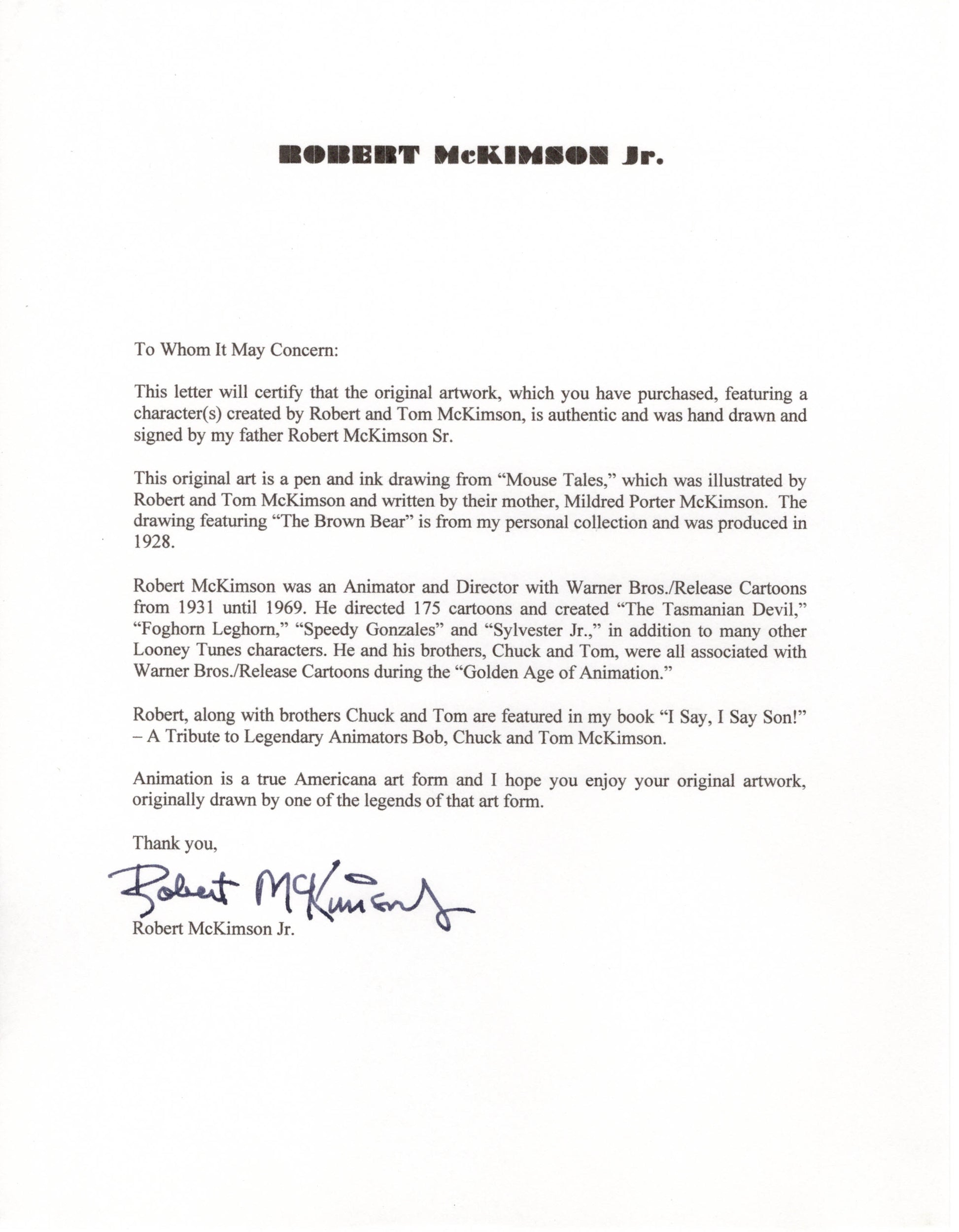 Robert McKimson Sr. is a legend in cartoons. As stated in the letter of authenticity from his son, he worked at Warner Brothers from 1931 to 1969 and directed 175 cartoons! He created the Tazmanian Devil, Foghorn Leghorn, Speedy Gonzalez and Sylvester Jr. to name a few of his characters!