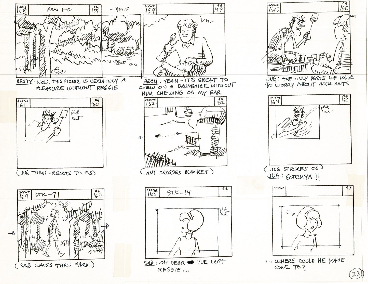 There's dialogue, action notes and scene numbers - it's a wonderful summary of these wonderful old cartoons! These are generally a mix of graphite pencil drawing/dialogue, ink and some COPIED panels (which are also sometimes hand-drawn over). Also - frequently the panels are drawn and then cut out and taped down in a new order. See picture and feel free to ask about individual panels.