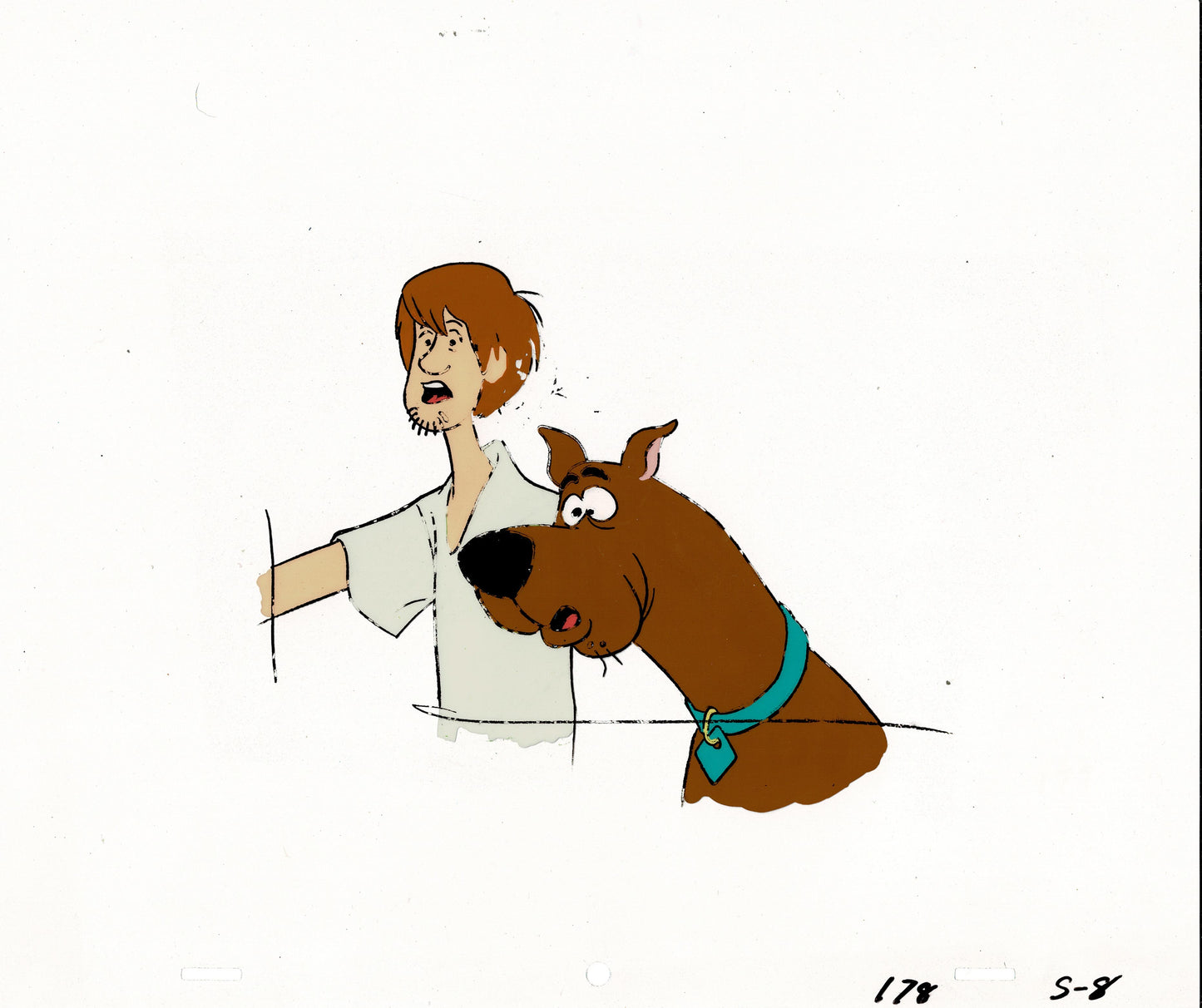 The New Scooby-Doo Movies was only the second incarnation of Scooby Doo! And this a nice setup of Shaggy and Scooby. It's from the 10th episode with Laurel and Hardy, "The Ghost of Bigfoot." The cel measures approx 10.5" x 12.5". Has some line loss/transfer, a paint jot missing, etc. We've included a screen capture of the scene when it was used. See picture.