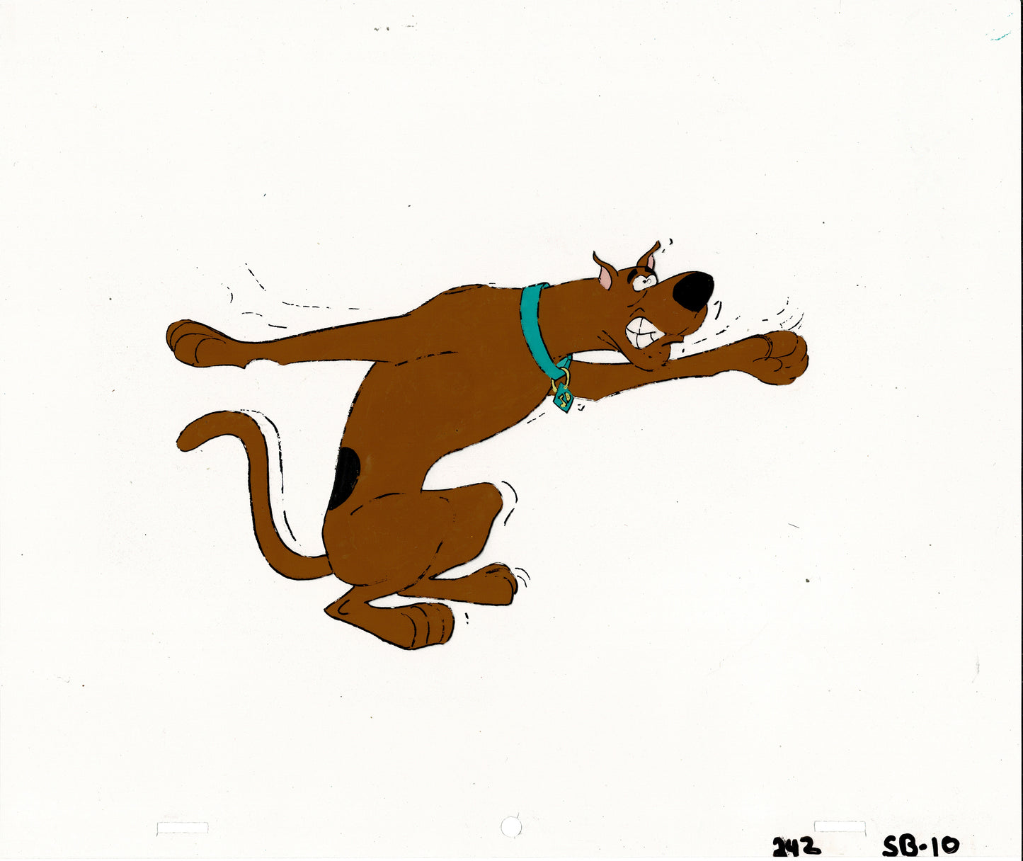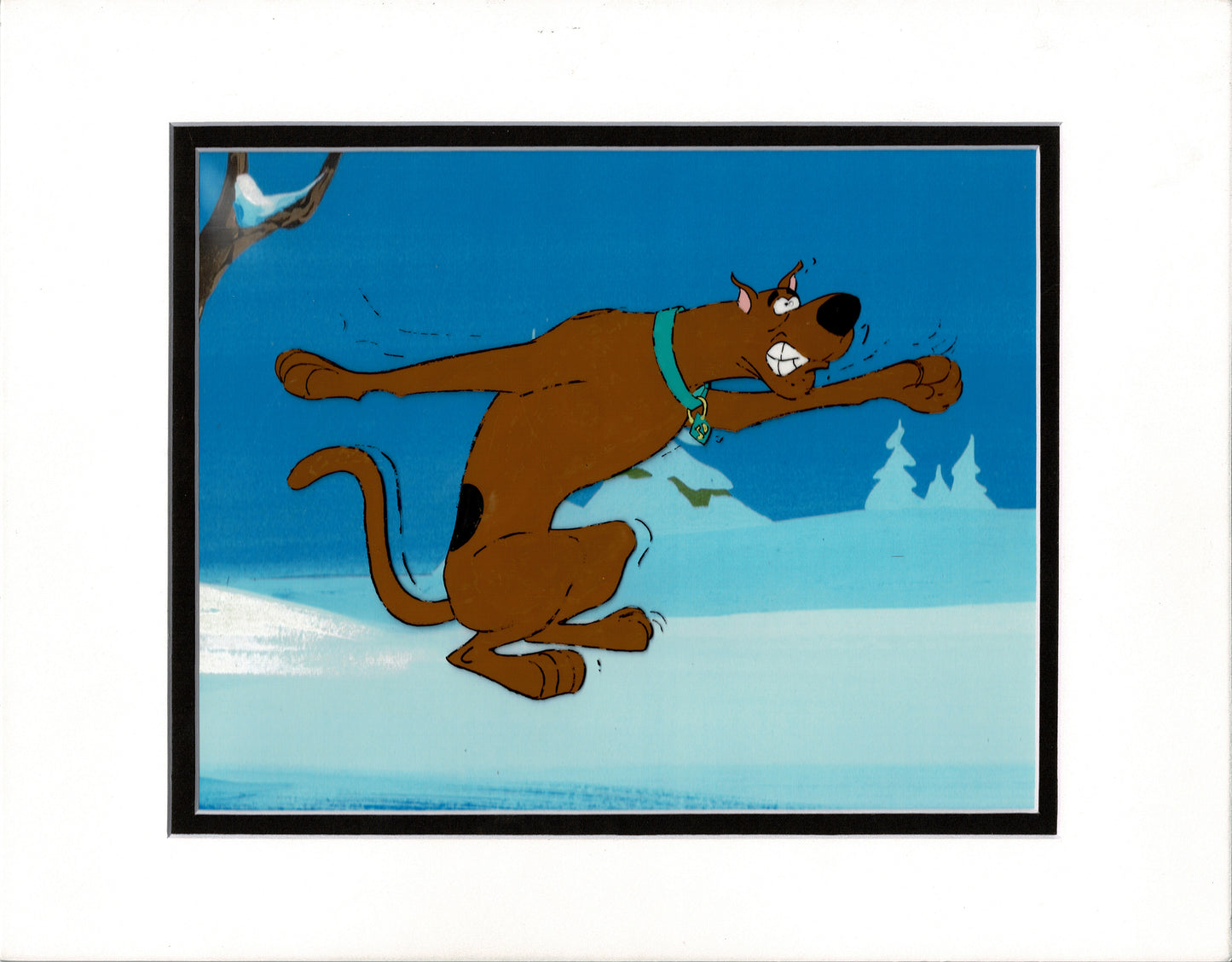 The New Scooby-Doo Movies was only the second incarnation of Scooby Doo! And this a nice full figure cel of Scooby-Doo. It's from the 10th episode with Laurel and Hardy, "The Ghost of Bigfoot." The cel measures approx 10.5" x 12.5". Has some line loss/transfer, etc. We've included a screen capture of the scene when it was used. See picture.