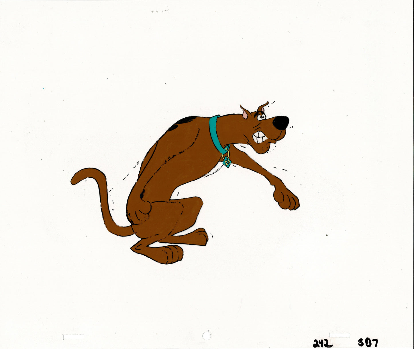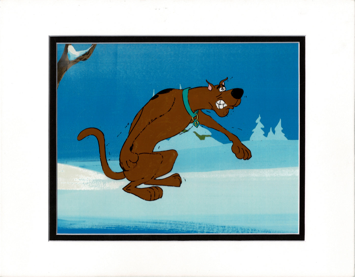 The New Scooby-Doo Movies was only the second incarnation of Scooby Doo! And this a nice full figure cel of Scooby-Doo. It's from the 10th episode with Laurel and Hardy, "The Ghost of Bigfoot." The cel measures approx 10.5" x 12.5". Has some line loss/transfer, etc. We've included a screen capture of the scene when it was used. See picture.