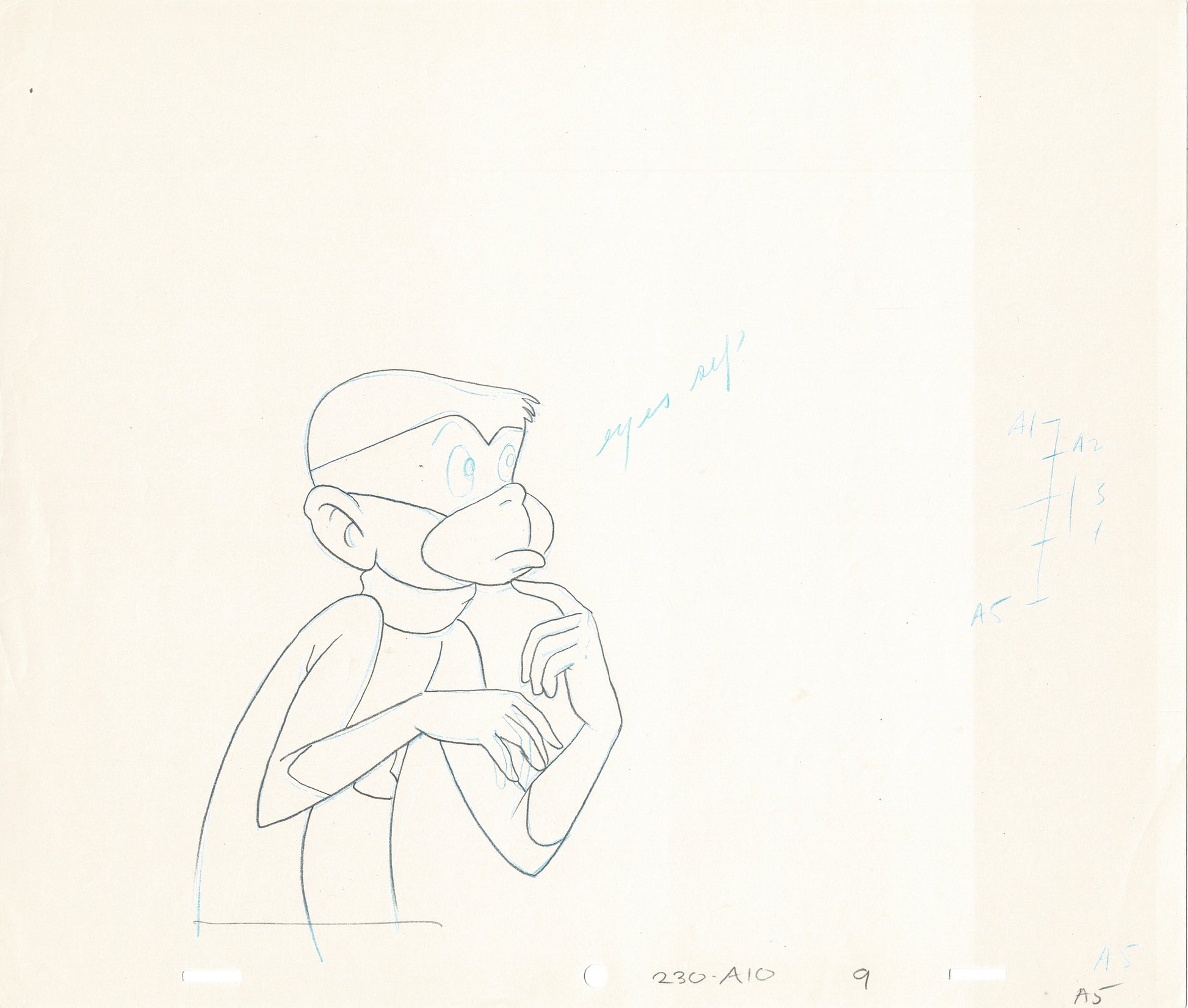An original production drawing of Blip! Hand-drawn by an animator and one-of-a-kind, used to make the cel that you see on screen! This is from the 1981 Space Stars version of this iconic cartoon. Measures approximately 10.5" x 12.5". Has some production wear (see scan).