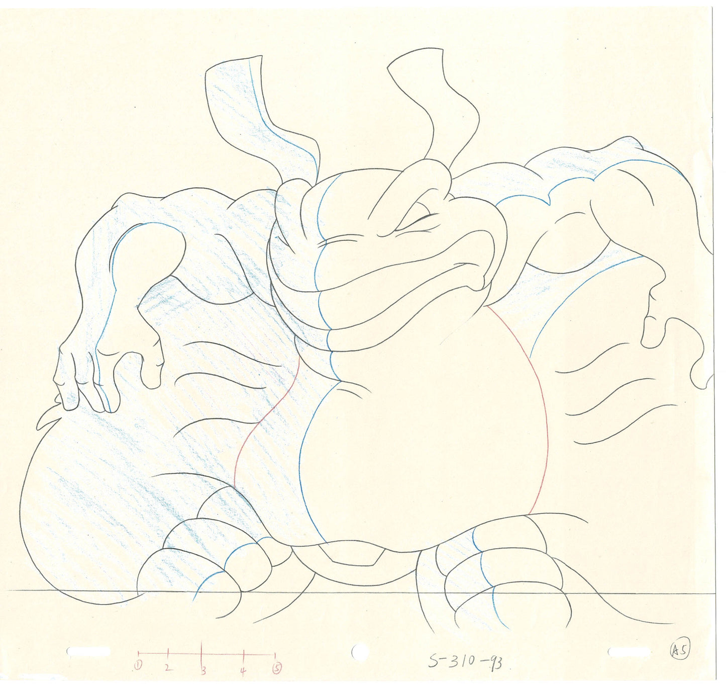 A nice production drawing actually used in making the cartoon. Measures 10" x 10.75". Some drawings have edge creasing, occasional foldes (not on the art but also not visible in the photos), smudges, etc. These were USED to make the show!