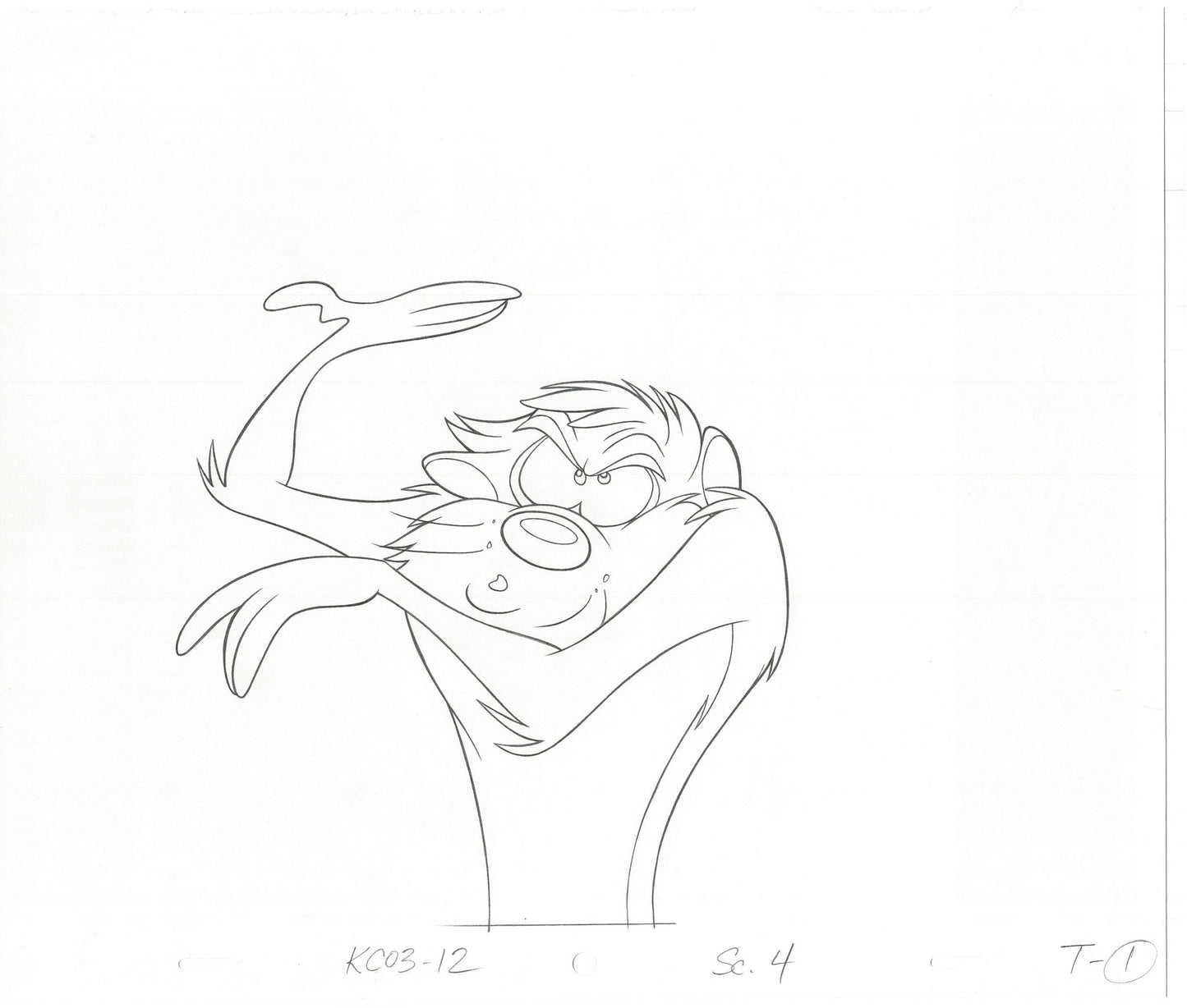 Taz is a classic Warner Brothers Looney Tunes character who first appeared in 1954, but gained even more popularity in the 90's and 2000's. And, in 2003 Warner Bros. released "Looney Tunes: Back in Action," a mixed live-action/animated film. They released a game at the same time called the "Tazmania Game" where you built a cage to keep Taz inside! These drawings are from the commercial for that game! Check out the commercial at the link below (starting around the :25 mark). . Measures approx. 10.5" x 12.5". If there are any horizontal lines in the drawing they're from our scanner, not on the drawing.