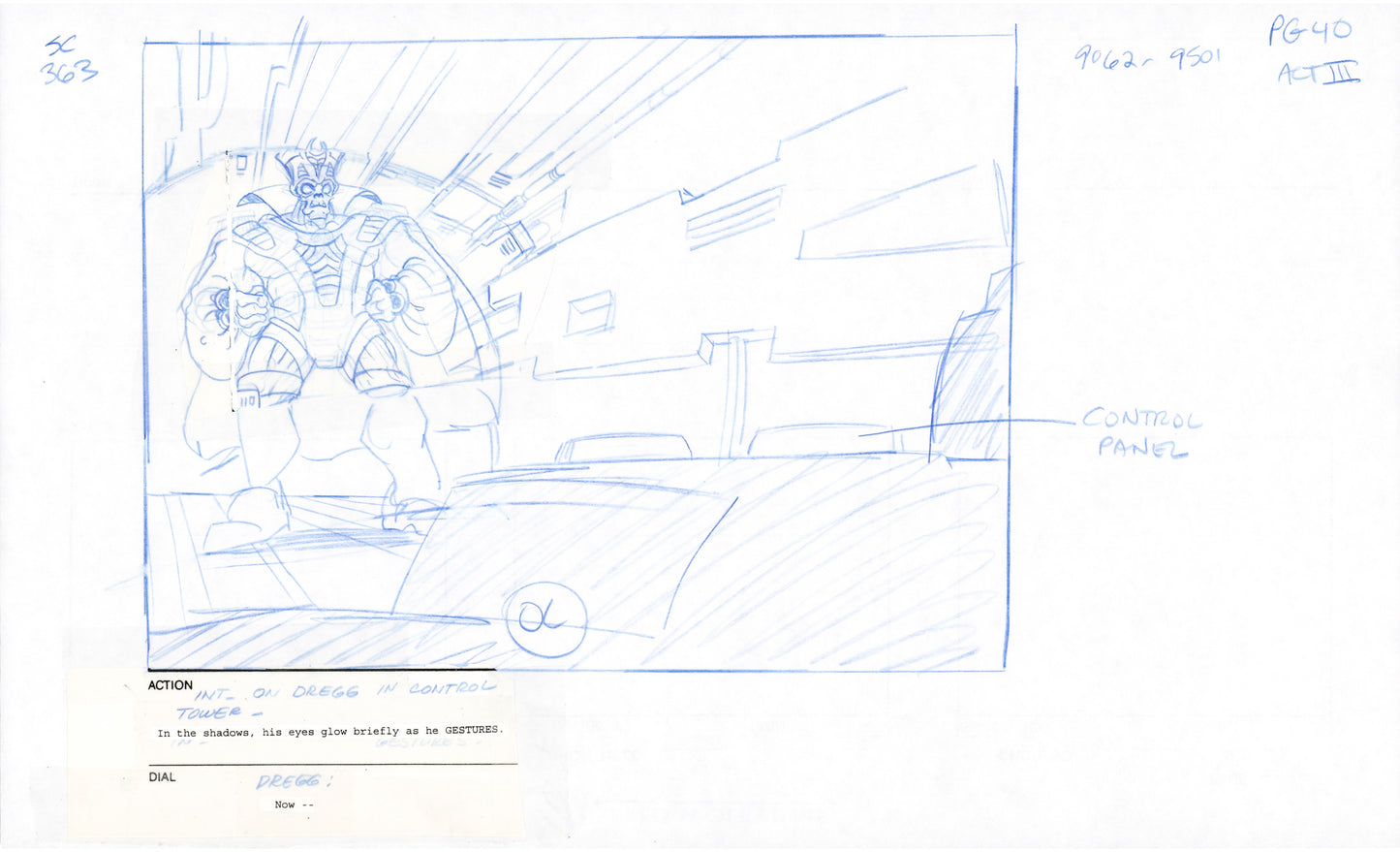 These are extremely rare and desirable! A hand-drawn page with three panels from the original, final storyboard from the original series episode of Teenage Mutant Ninja Turtles, "The Unknown Ninja." We've shown a picture of the title page for the storyboard set (not included). This page measures approx. 8.5" x 14". Some of the pages have pasted down panels, pasted down text, hand-written text, notes, tape, etc.
