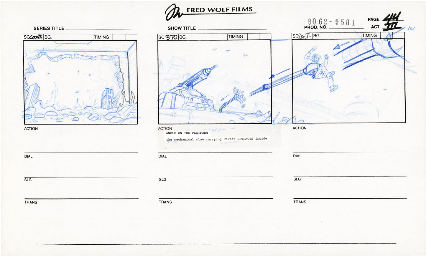 These are extremely rare and desirable! A hand-drawn page with three panels from the original, final storyboard from the original series episode of Teenage Mutant Ninja Turtles, "The Unknown Ninja." We've shown a picture of the title page for the storyboard set (not included). This page measures approx. 8.5" x 14". Some of the pages have pasted down panels, pasted down text, hand-written text, notes, tape, etc.