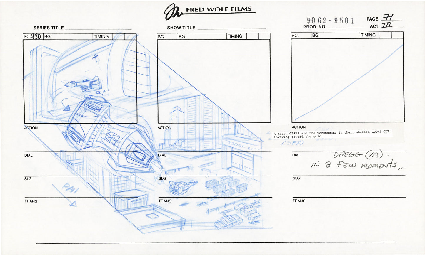 These are extremely rare and desirable! A hand-drawn page with three panels from the original, final storyboard from the original series episode of Teenage Mutant Ninja Turtles, "The Unknown Ninja." We've shown a picture of the title page for the storyboard set (not included). This page measures approx. 8.5" x 14". Some of the pages have pasted down panels, pasted down text, hand-written text, notes, tape, etc.
