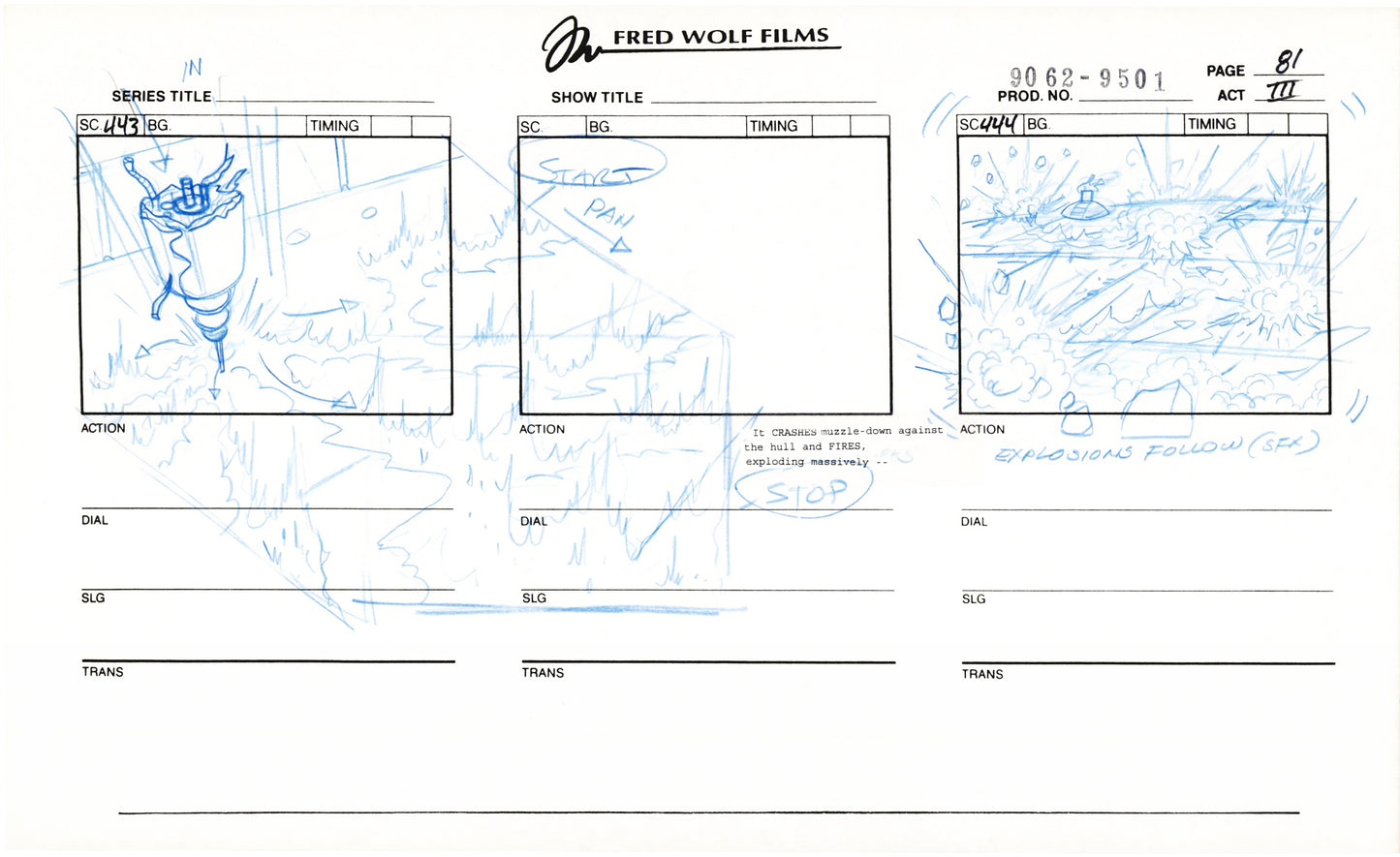 These are extremely rare and desirable! A hand-drawn page with three panels from the original, final storyboard from the original series episode of Teenage Mutant Ninja Turtles, "The Unknown Ninja." We've shown a picture of the title page for the storyboard set (not included). This page measures approx. 8.5" x 14". Some of the pages have pasted down panels, pasted down text, hand-written text, notes, tape, etc.