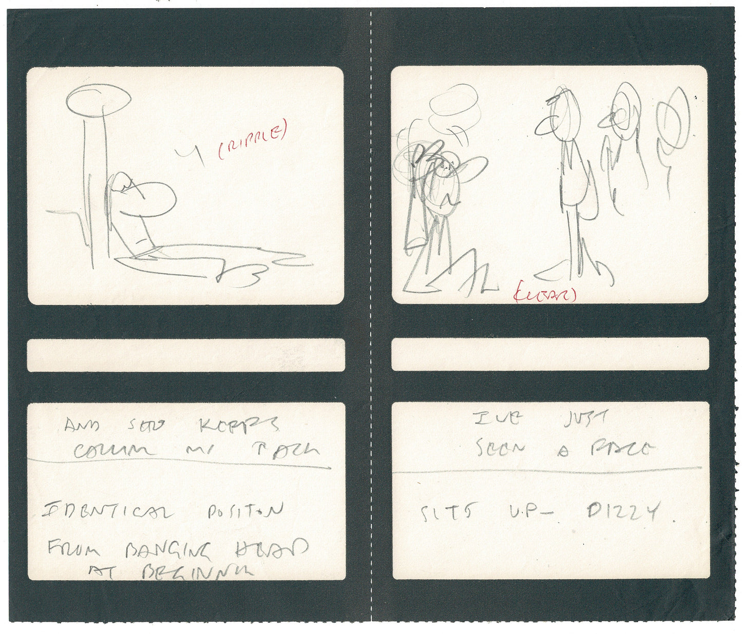 This gorgeous 2-panel hand-drawn storyboard is the original storyboard for a scene in the 1967 episode "Tomorrow Never Knows/I've Just Seen a Face" and features THE ACTUAL LYRICS from the song "I've Just Seen A Face" on the board! In addition to rough drawings of all four of the Fab 4 as well! In this episode Ringo loses his voice and the other three send him to a haunted house to "scare" his voice back into him! This scene is actually repeated twice in the cartoon with slight adjustments.