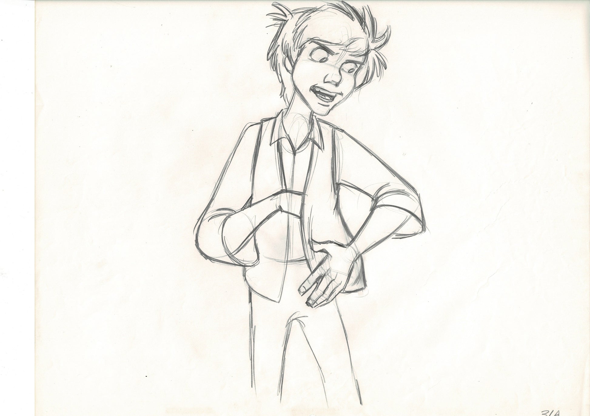 It has production wear including some crinkling and a light yellow tone. These are prelim drawings and they changed his outfit for the final scene, which appears around the 15:03 mark.