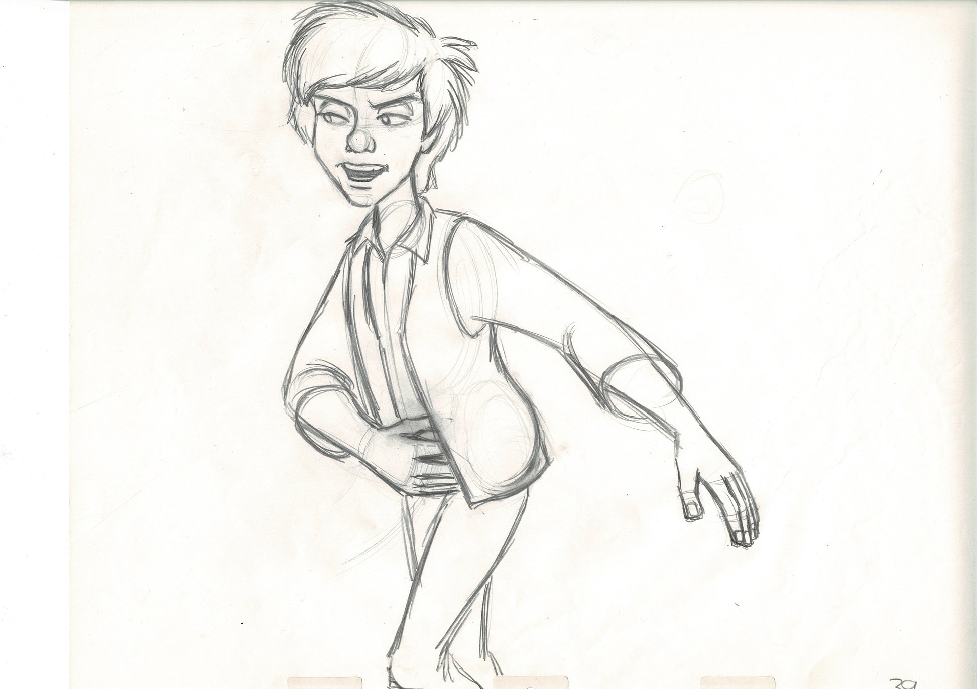 It has production wear including some crinkling and a light yellow tone. These are prelim drawings and they changed his outfit for the final scene, which appears around the 15:03 mark.