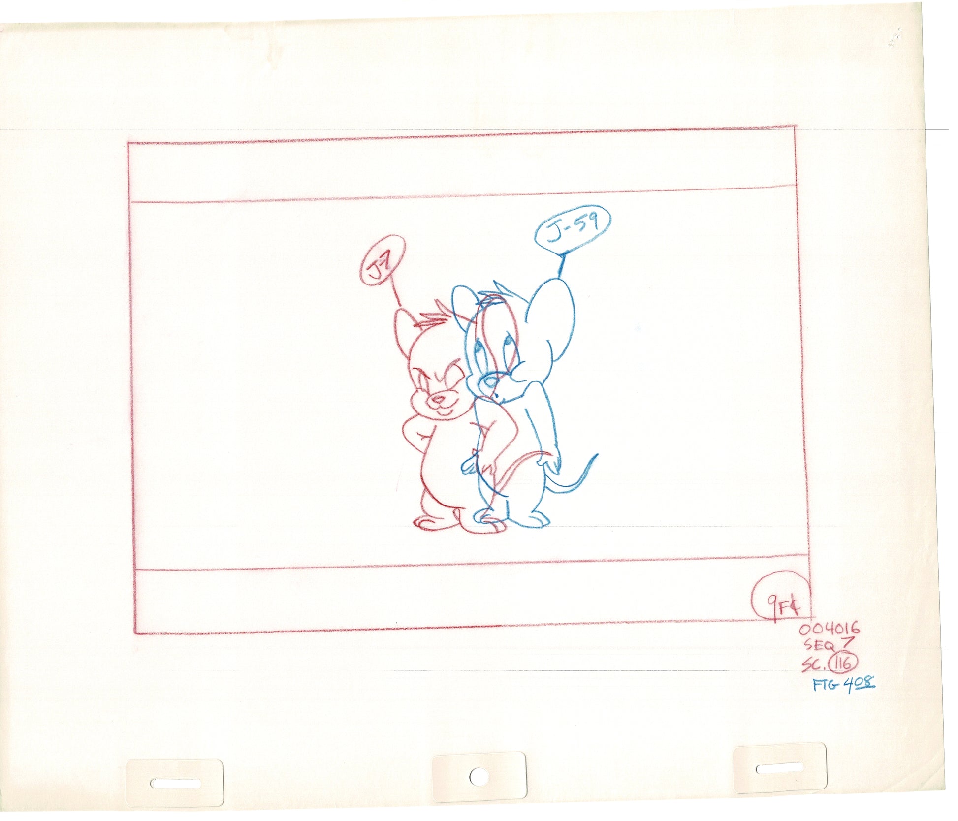 A production drawing used in the 1992 Tom and Jerry Movie. Hand-drawn by an animator for the production. Approximately 10.5" x 12.5". Has production wear and light yellow aging. NOTE: our scanner often adds a darker band on one side of a sheet of paper - that is NOT on the paper in real life.