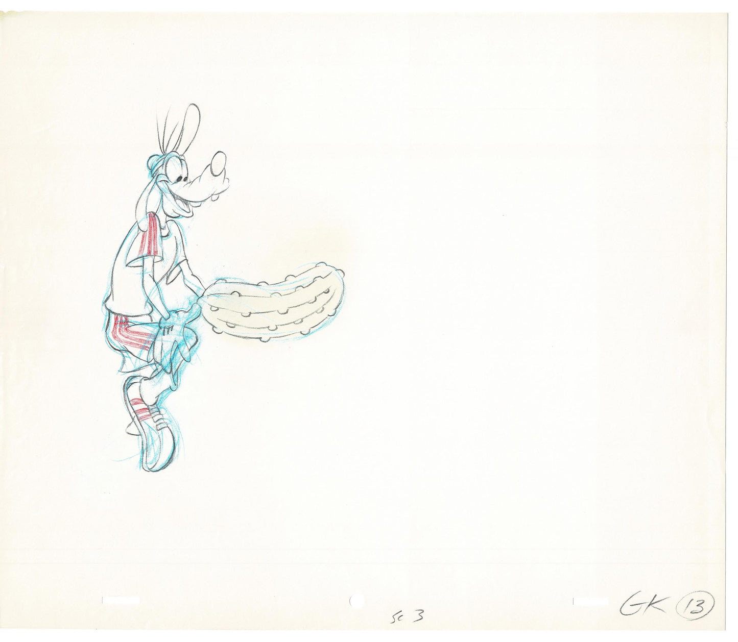 So, we don't know which this is from, though oddly most of his costume is consistent with the cover of a VHS and with the cover of the old Atari video game! So we think this is 1970's or 1980's. And we have the entire scene of him kicking a pickle like a football - and then his socks! The wonderful thing is that there's additional colored pencil line accents on these. NOTE: we've shown pictures of the VHS cover and the Atari cover - NEITHER OF THESE IS INCLUDED - this is for the ANIMATION DRAWING ONLY.