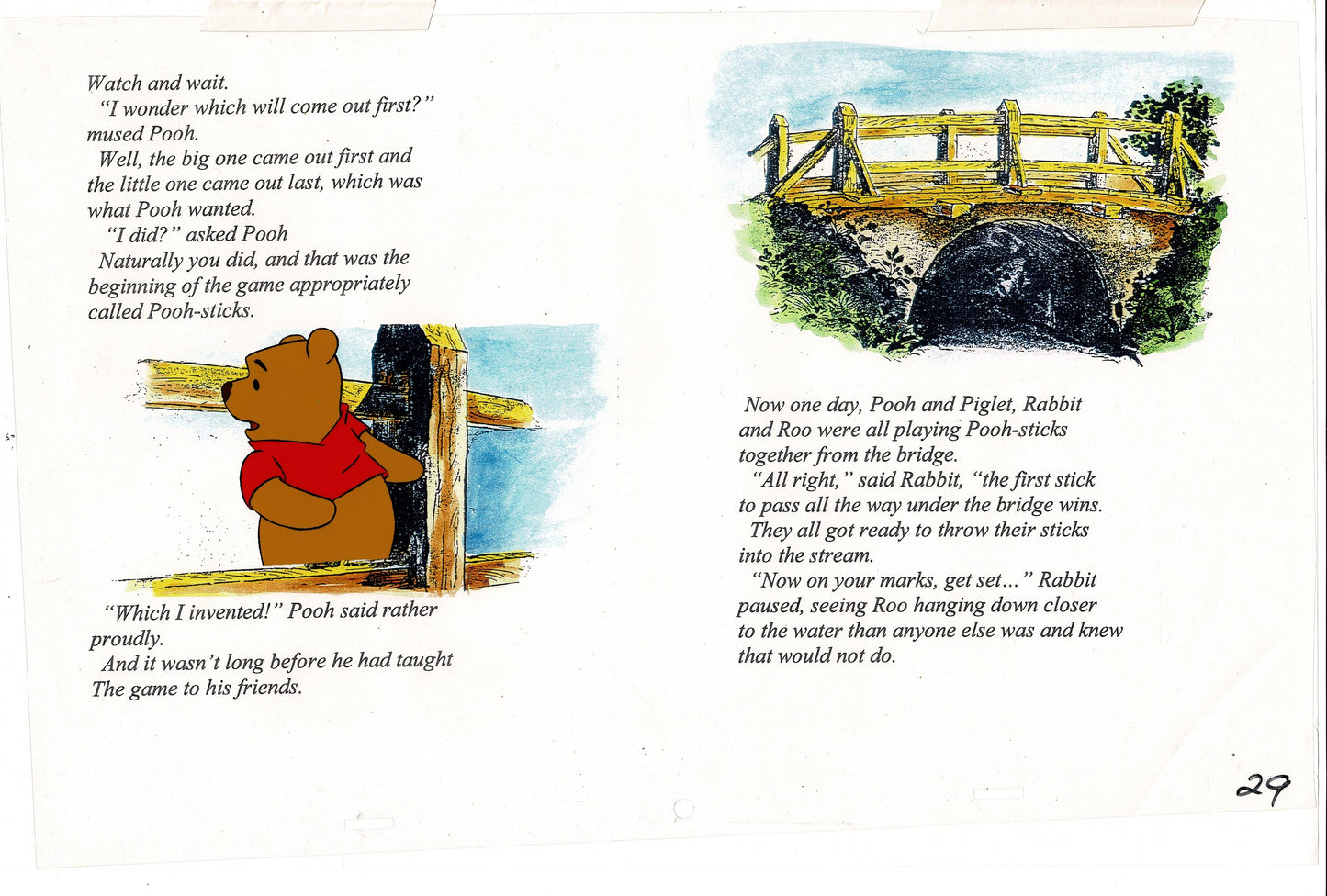 And this is an amazing, hand-painted, screen-used pan production cel from the featurette! Incredibly, we have a sequence of them from one of the iconic story-page sections that we all remember so well from all the original Pooh movies! The scene starts around the 5:32 mark, depending on your version of the featurette. The cel includes a color laser copy of the background used, with all the words of the book on it!