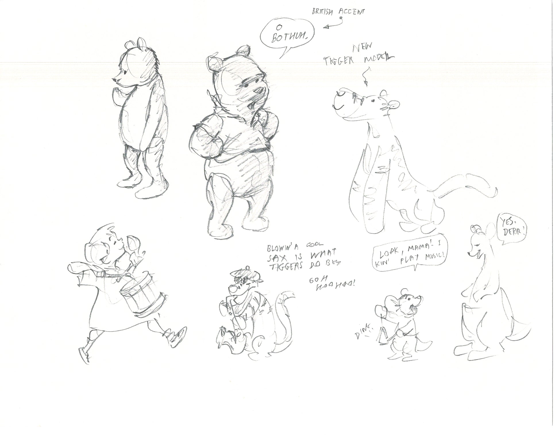 Wendell had a very long history working on Disney's Winnie the Pooh. Earlier in his career he worked on some of the 1970's/1980's educational film strips all the way up to Pooh's Grand Adventure: The Search for Christopher Robin (1997). While his IMDB doesn't have him listed as working on New Adventures, we have his notes, listing "4w87-010 - Pooh Oughta Be In Pictures," "4w87-051 - Balloonatics," and "4w87-130 - Paw and Order" as episodes he worked on - we believe these drawings are from those episodes.